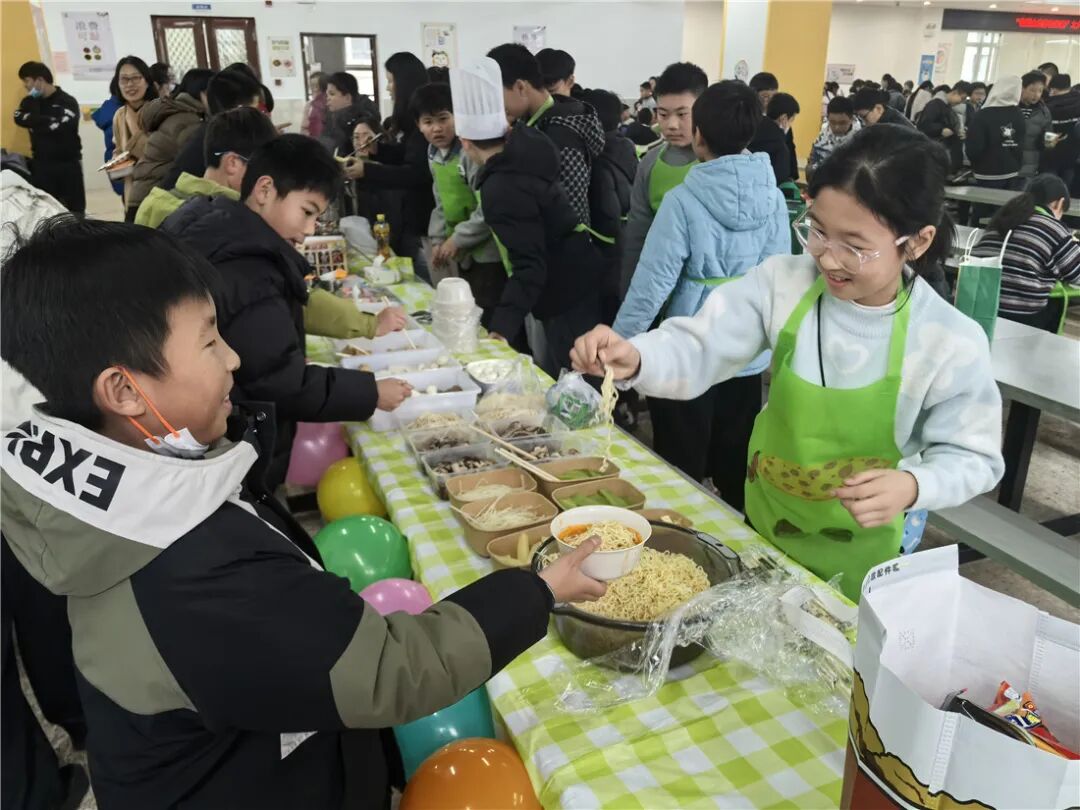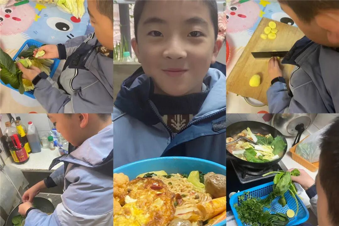 在家长的指导下,学生们纷纷系上围裙,自己处理食材:洗菜、串签、熬制汤底。从生疏到熟练,他们在烟火气中体验从原材料到一碗成品的完整过程。这份亲手劳动的经历,让孩子们对“一餐一饭的来之不易”有了最切身的体会。