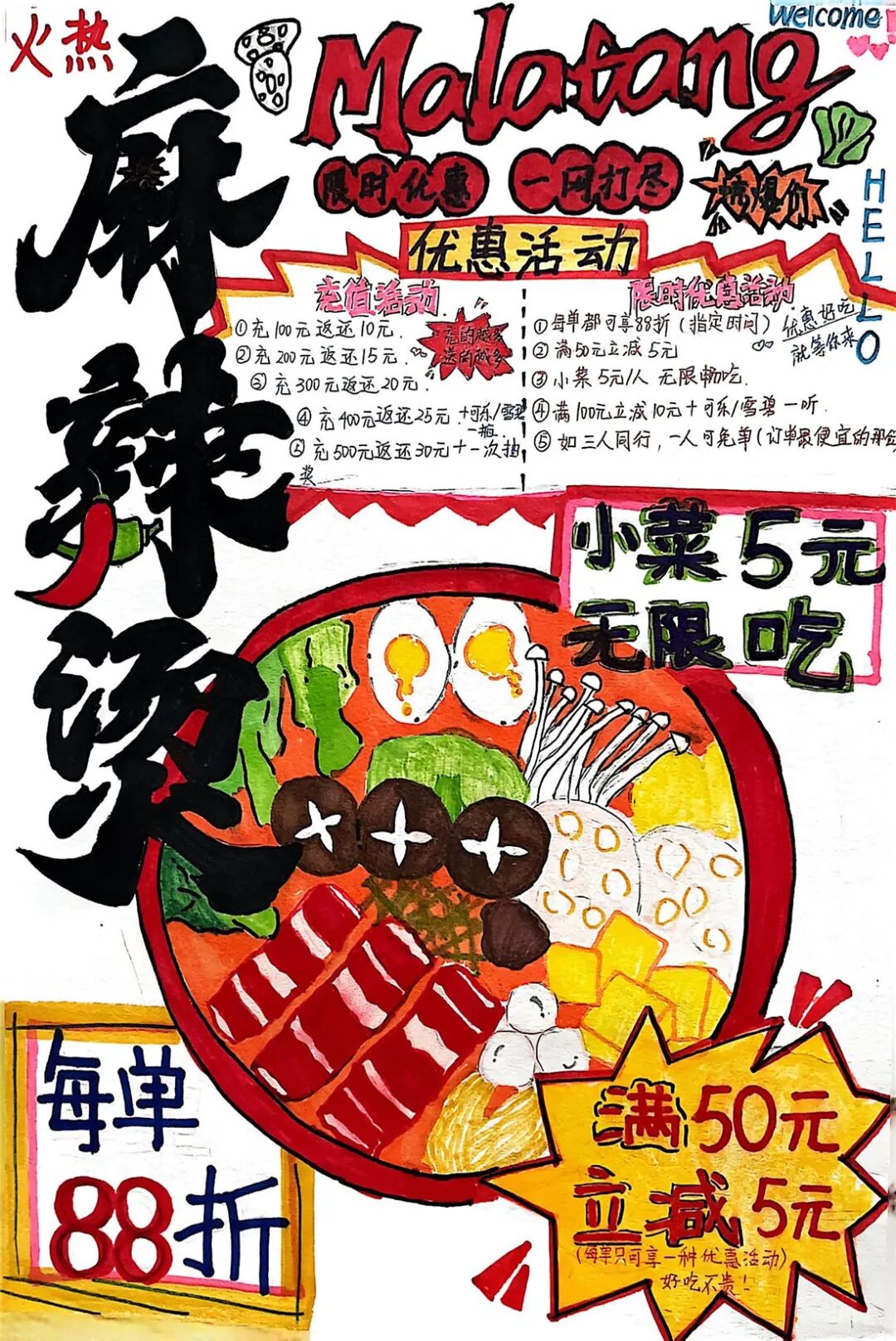 作为“品牌设计师”,学生们将经营理念转化为视觉语言。他们精心设计开业海报与摊位招牌:有的突出“暖心暖胃”的标语,有的绘制可爱诱人的食物卡通,有的则打造时尚潮流的视觉风格。色彩、构图与文案的每一次斟酌,都是一次将商业逻辑与艺术创意相结合的综合实践。