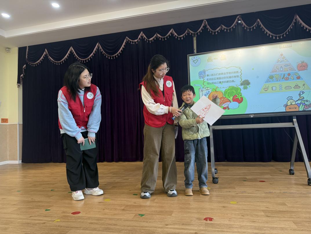 活动首个环节以“食物分类连连看”游戏展开。通过“食物分类连连看”游戏,引导幼儿直观辨别天然食材与深加工食品。孩子们在动手归类中,不仅学会了区分食物的基本属性,更在大学生志愿者的引导下理解了“为什么吃”比“吃什么”更重要。这一过程旨在为幼儿建立对健康饮食的初始认知框架,将均衡膳食的观念化为具体可感的视觉印象,为日后自主选择打下理性基础。