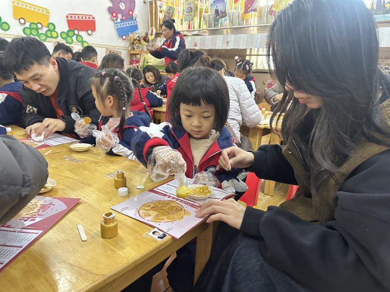 健康科普结束后,便到了孩子们期待的手工环节,社区志愿者分发了福字雕版、环保油墨和日历底板等材料,并协助孩子们开始制作。孩子们将雕版放置在红色日历纸上,用海绵蘸取油墨按压拓印,随后小心翼翼地揭开,一个个金色的“福”字跃然纸上,孩子们兴奋地举起自己的作品互相展示。