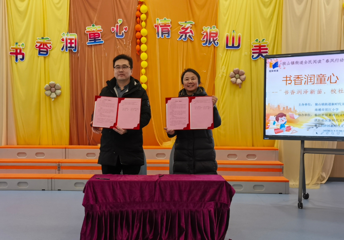 活动伊始,现场荧幕上循环播放的《全民阅读促进条例》宣传视频,已悄然铺开“人人皆读、时时可读、处处宜读”的怡人画卷。随着主持人热情开场,南通市滨江小学代表与狼山镇街道代表并肩登台开启“书香润泽新苗,校社共筑未来”共建项目,双方代表郑重签署《“书香社区”共建协议》,交换文本后合影留念。狼山镇街道代表卞剑磊说:“我们将结合狼山人文资源围绕阅读推广、文化研学等内容开展常态化合作,通过校社携手助力学生全面发展,让书香与本土文化浸润校园社区。”