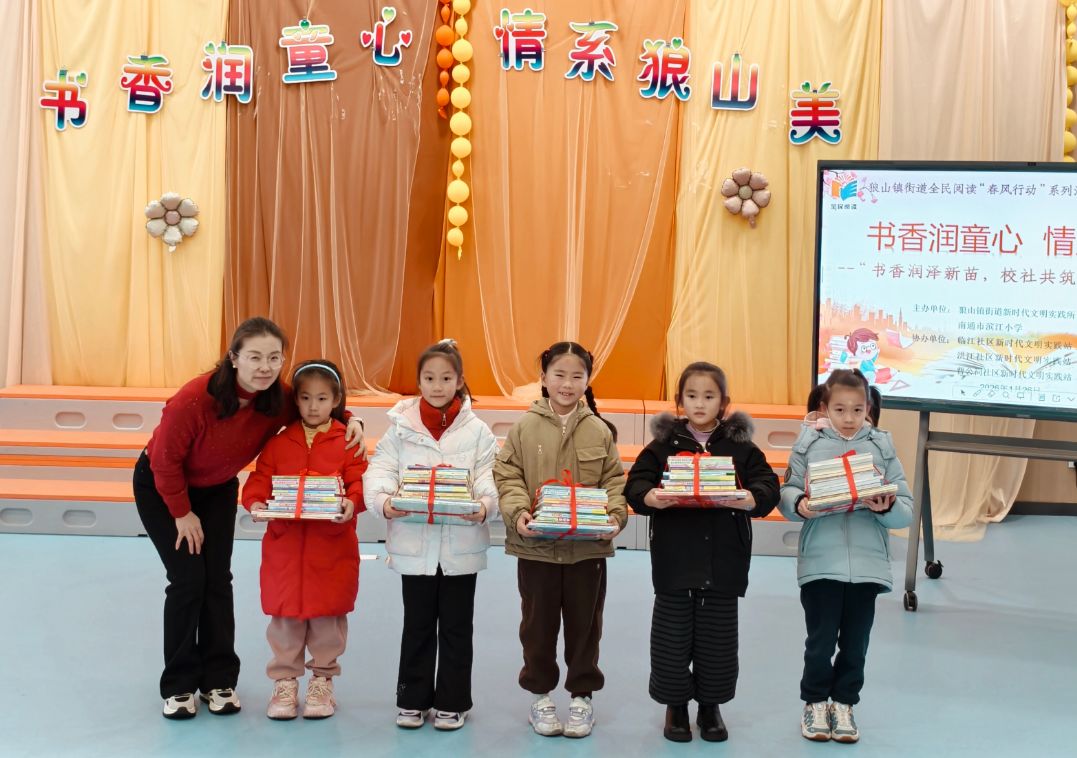 随后的全民阅读“春风行动”赠书环节洋溢着温暖与期盼。狼山镇街道志愿者将承载着狼山人文故事的《家在狼山》和“春风阅读礼包”递到孩子们手中。接过赠书的学生开心地说:“我要好好读这些书,和大家一起寻找书里写的狼山故事!”