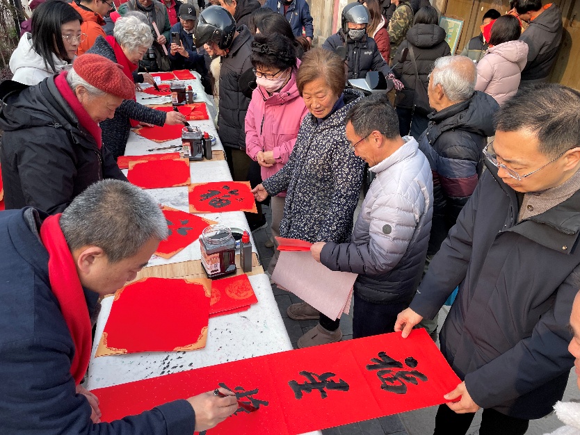 活动现场墨香四溢,暖意融融。民盟书法家冯智、张晏、王树堂、周时君应邀齐聚一堂,铺纸研墨,挥毫泼墨。顷刻间,一个个苍劲饱满的“福”字、一幅幅寓意吉祥的春联便跃然纸上,既有对国泰民安的祈愿,也饱含对街坊邻里的美好祝福。闻讯而来的居民和游客络绎不绝,或驻足欣赏,或精心挑选,欢声笑语与浓郁墨香交织,为古朴的寺街增添了喜庆热烈的节日气氛。许多老街坊手持散发着墨香的春联,高兴地表示,这样的活动不仅送来了祝福,更让人感受到了浓厚的年味。