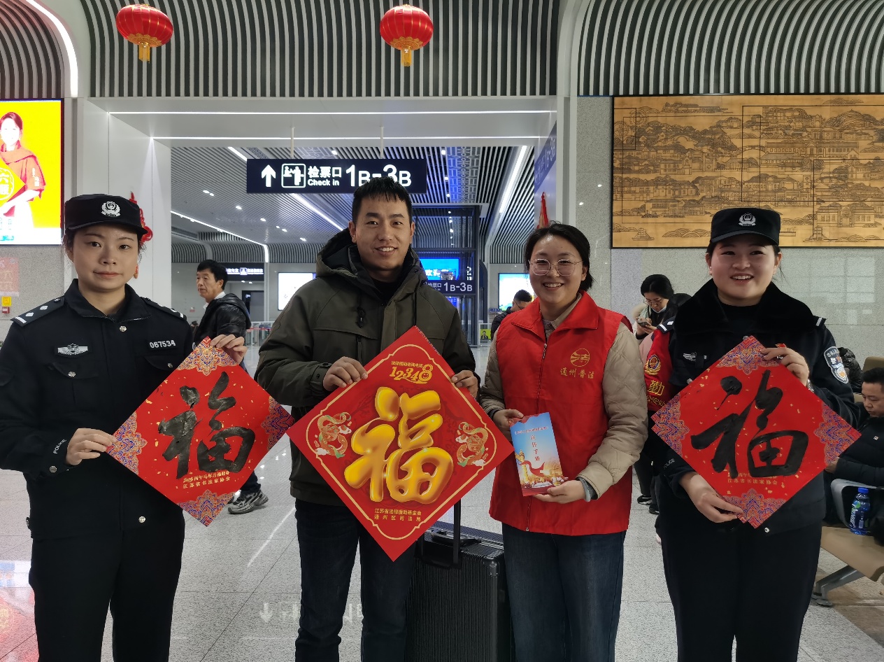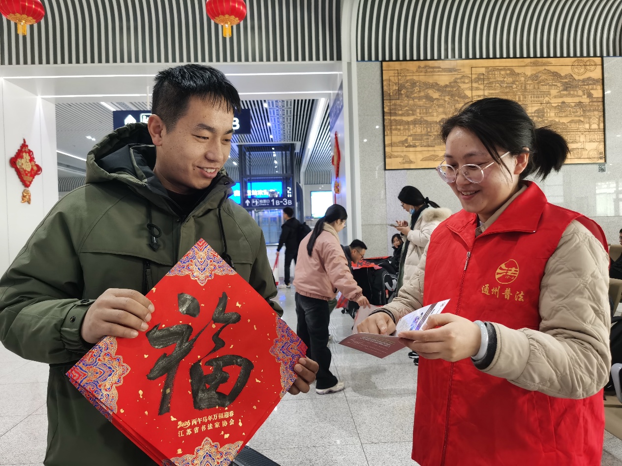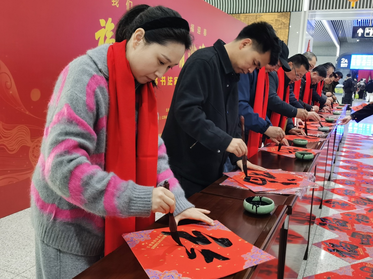 中国江苏网讯 2月1日上午,《福至运来 情满旅途》2026江苏省千名书法家送万福进万家活动中,南通市书法协会数十名著名书法家来到南通西站,为旅客们写“福”字、送春联、送祝福。
