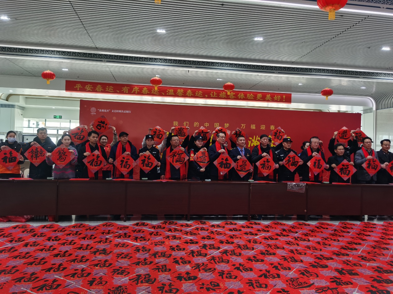 活动现场,书画家们挥毫泼墨,书写了一张张“福”字,吸引多名旅客驻足观看。