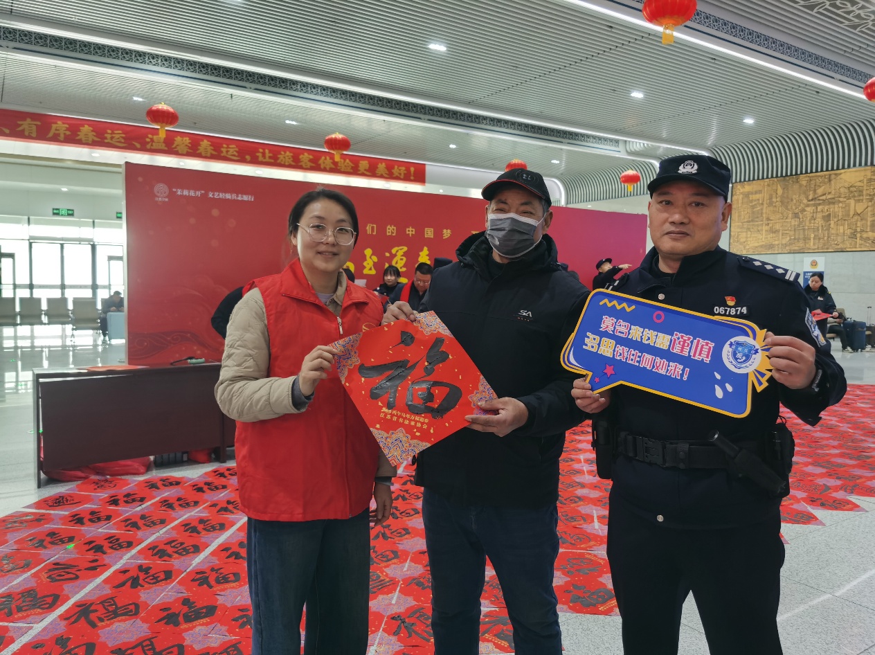 民警和司法所工作人员将书画家们写好的“福”字送给过往的旅客,并为旅客送上马年礼品和春运安全宣传品,拿到礼物的旅客们脸上洋溢着幸福的笑容,现场气氛热闹,充满了温馨的年味。