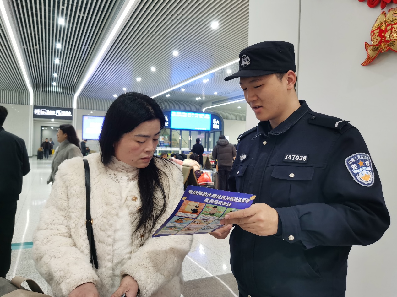 民警详细讲解“抢票软件诈骗”“冒充客服退票”“虚假拼车”等春运期间高发诈骗的套路,并通过反诈知识大转盘、趣味答题等形式,帮助旅客加深理解,把满满的诈骗小技巧带回家。