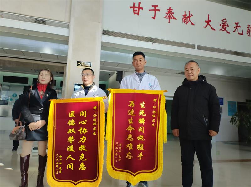 2月3日上午,康复出院的徐先生和家人专程来到南通通州区石港中心卫生院,将两面鲜红的锦旗送到急诊内科主治医师邱栋峰和CT室副主任医师任建锋手中,感谢他们的救命之恩。
