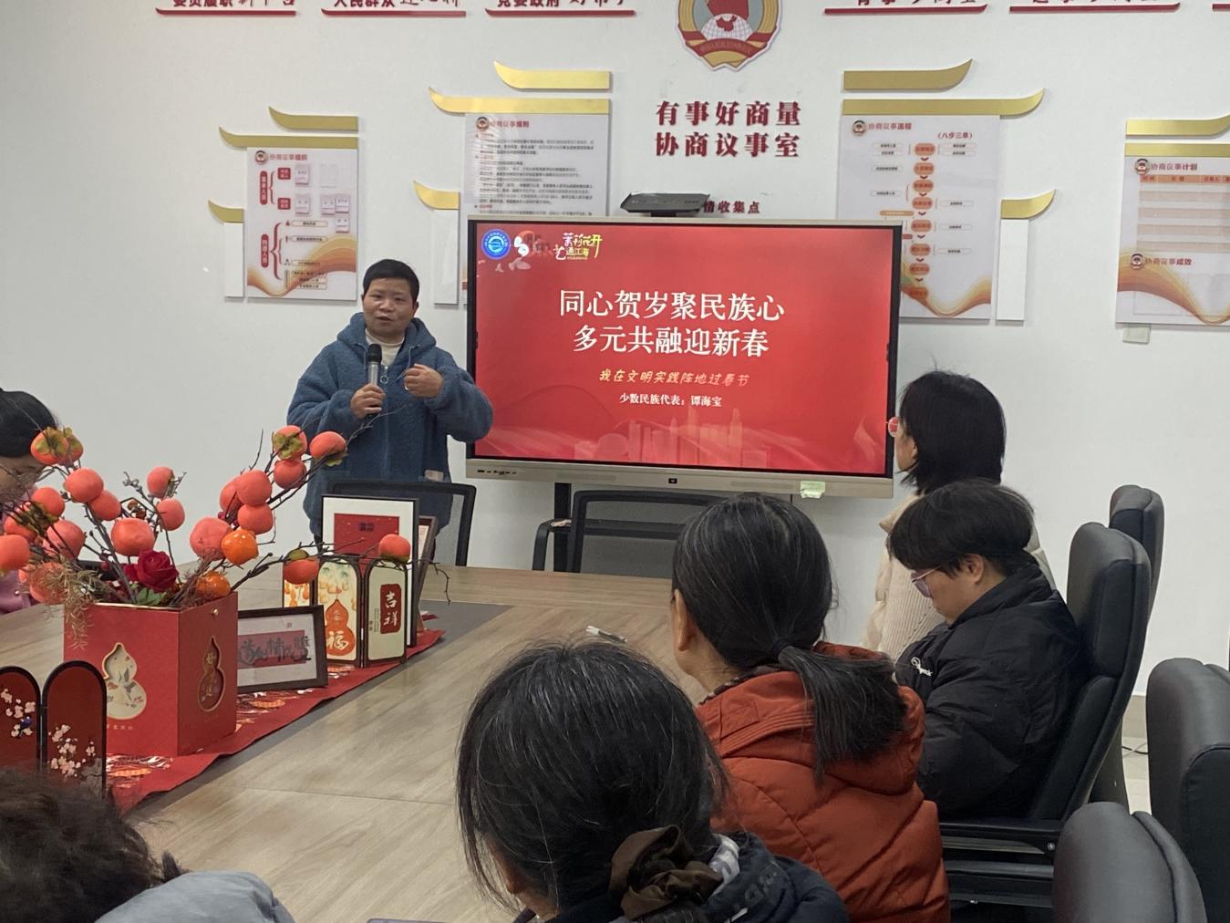 中国江苏网讯 近日,为共庆新春佳节,进一步凝聚社区多元力量、促进邻里融合,崇川经济开发区朝东埭社区以“茉莉花开·艺通江海”文化品牌为依托,精心策划举办了“立春贺岁启新岁 同心团圆迎新春——我在文明实践阵地过春节”主题活动。活动聚焦党员教育、民族团结与文明实践,通过法律讲座、民俗分享、手工体验三大环节,为辖区流动党员、新业态就业群体、少数民族党员及居民代表带来一场有温度、有深度、有乐趣的新春文化盛宴。
