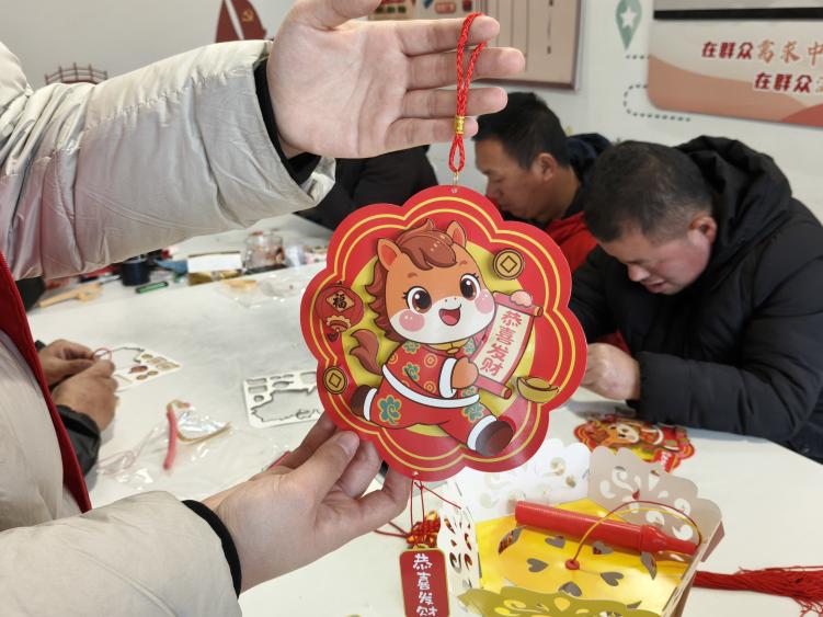 居民们热情高涨,迅速投入到手工制作中。大家围坐在一起,剪贴纸、摆造型、贴装饰,互相交流制作心得。一剪一贴中,一个个装饰精致、寓意吉祥的新年挂件陆续完工,每一件作品都承载了福运安康的美好寓意,饱含了居民对新年的美好期盼。居民们拿着自己亲手制作的挂件,互相展示分享、彼此称赞,脸上洋溢着幸福的笑容。“这个挂件做起来简单又好看,还让我们感受到了浓浓年味,特别高兴!”参加活动的居民笑着说。