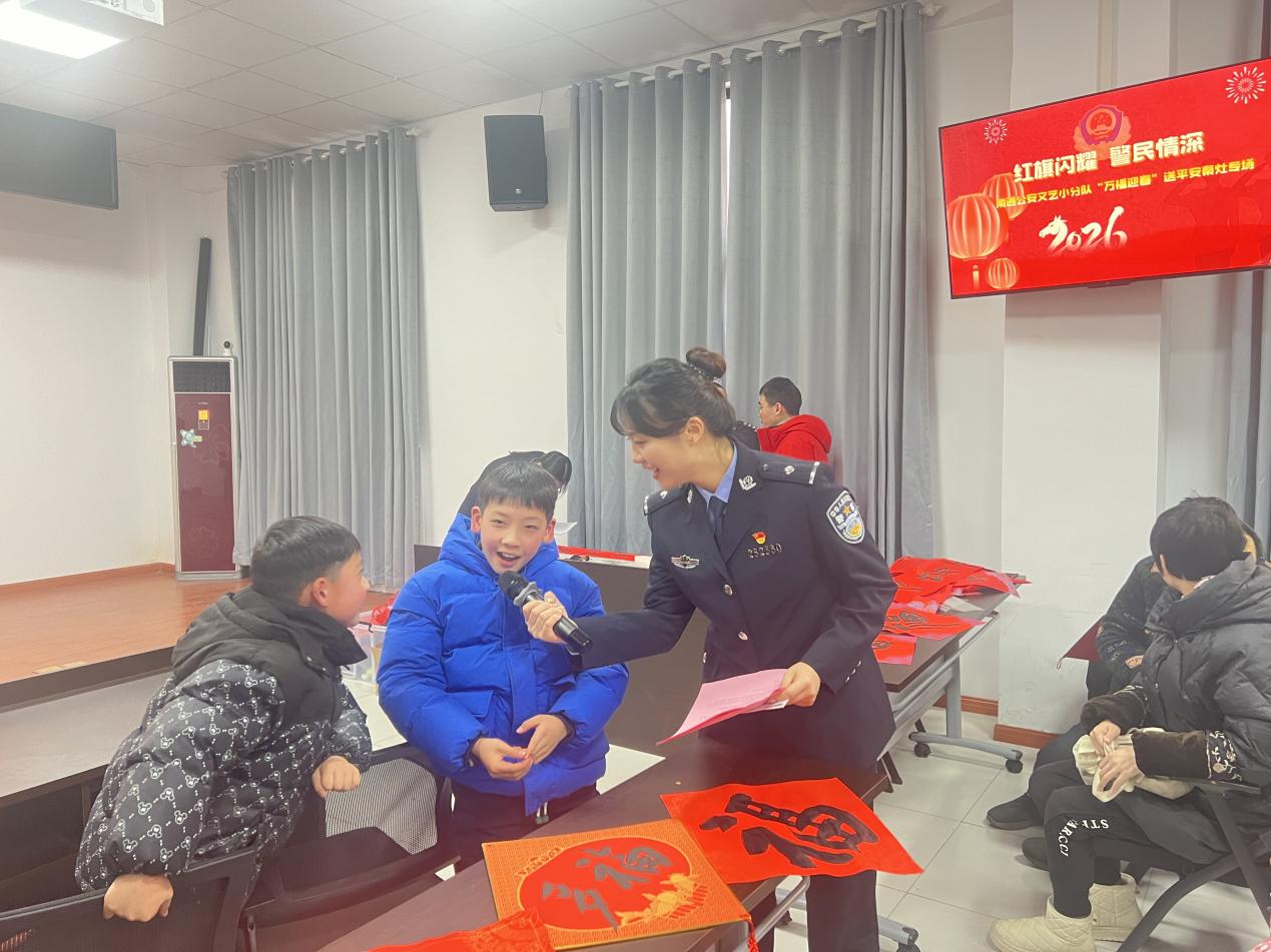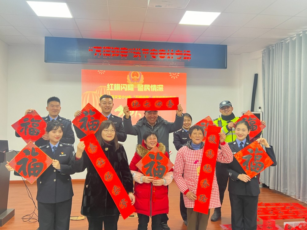演出现场的另一侧,写福送春联专区同样人气爆棚。擅长书法的民警铺好红纸、拿起毛笔,凝神聚力间,一幅幅笔力遒劲的福字、一副副寓意吉祥的春联跃然纸上。“平安二字值千金,和顺一门有百福”“警民同心护家园,新春大吉迎好运”,每一副春联都饱含着对居民的美好祝福,每一个福字都承载着对平安生活的期盼。居民们排着队,或是认真挑选福字,或是提出个性化需求,民警们一一满足,现场墨香四溢、暖意融融。百余副福字、春联被居民们开心地带回家,不仅为即将到来的春节增添了浓浓的年味,更拉近了警民之间的距离,让警民同心的情谊在笔墨间静静流淌。