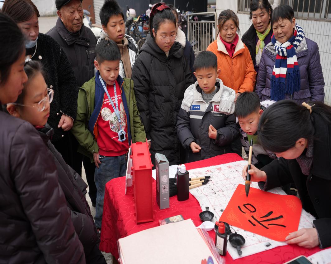 “年画中胖娃娃抱鲤鱼,大家知道寓意什么吗?”“那叫‘年年有余’,图个吉利!”活动现场,新时代文明实践站志愿者围绕春联起源、平仄对仗、年画寓意、贴春联技巧等内容展开互动问答,问题贴近生活、趣味十足。“那上下联怎么分呢?记住‘上仄下平’——最后一个字是三四声的贴上联,一二声的贴下联!”志愿者一边讲解,一边举着对联示例。现场气氛紧张活泼,答对的居民不仅收获掌声,还获得了书法作品集、新春挂饰等小奖品。“既学到了年俗知识,又拿到了新春彩头,这活动办到咱心坎里了!”大家手持春联、年画和“福”字,相互展示合影,红彤彤的春联、金灿灿的福字,交织成动人的迎春画卷让年味愈发浓郁,也让文明新风浸润人心。