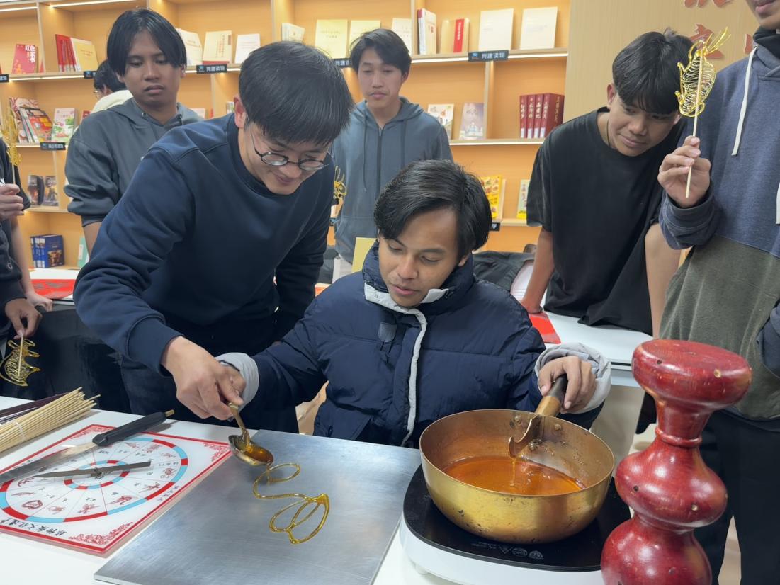 现场氛围从舌尖延伸至指尖。糖画制作作为一项历史悠久、技艺精巧的传统民间手工艺,吸引了众多参与者驻足体验。糖画手艺人在现场完整展示了熬糖、绘形、成画的工艺流程后,来自印尼的留学生曾友华在糖画艺人指导下尝试绘制简易图案,虽略显稚嫩却趣味盎然:“糖画既是甜蜜的食物,又是精美的艺术,也让我看到了中国传统手艺的智慧。”