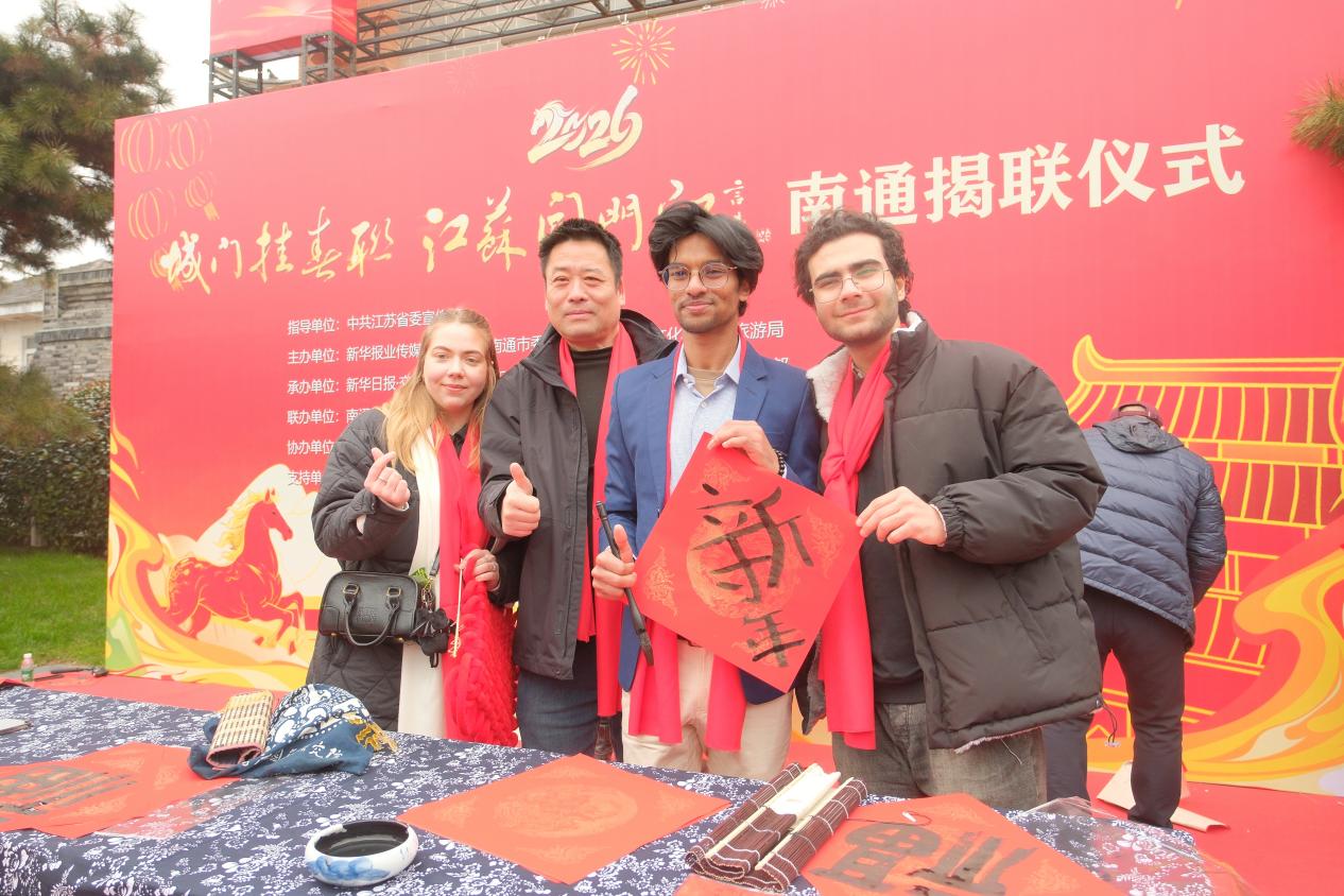 崇川区委常委、宣传部部长杨晶晶为国际传播体验官们赠送象征中外友谊的中国结,外国友人现场送上新春祝福,用真挚话语传递对南通的热爱与对新年的期盼,勾勒出中外文化交融的美好画面。俄罗斯的MAKSIMOCHKINA ANASTASIIA直言现场震撼,已然爱上中国春节。伊朗的DEHGHANKAMAREJI MAHAN则送上祝福,愿红红的对联带来火火的一年。