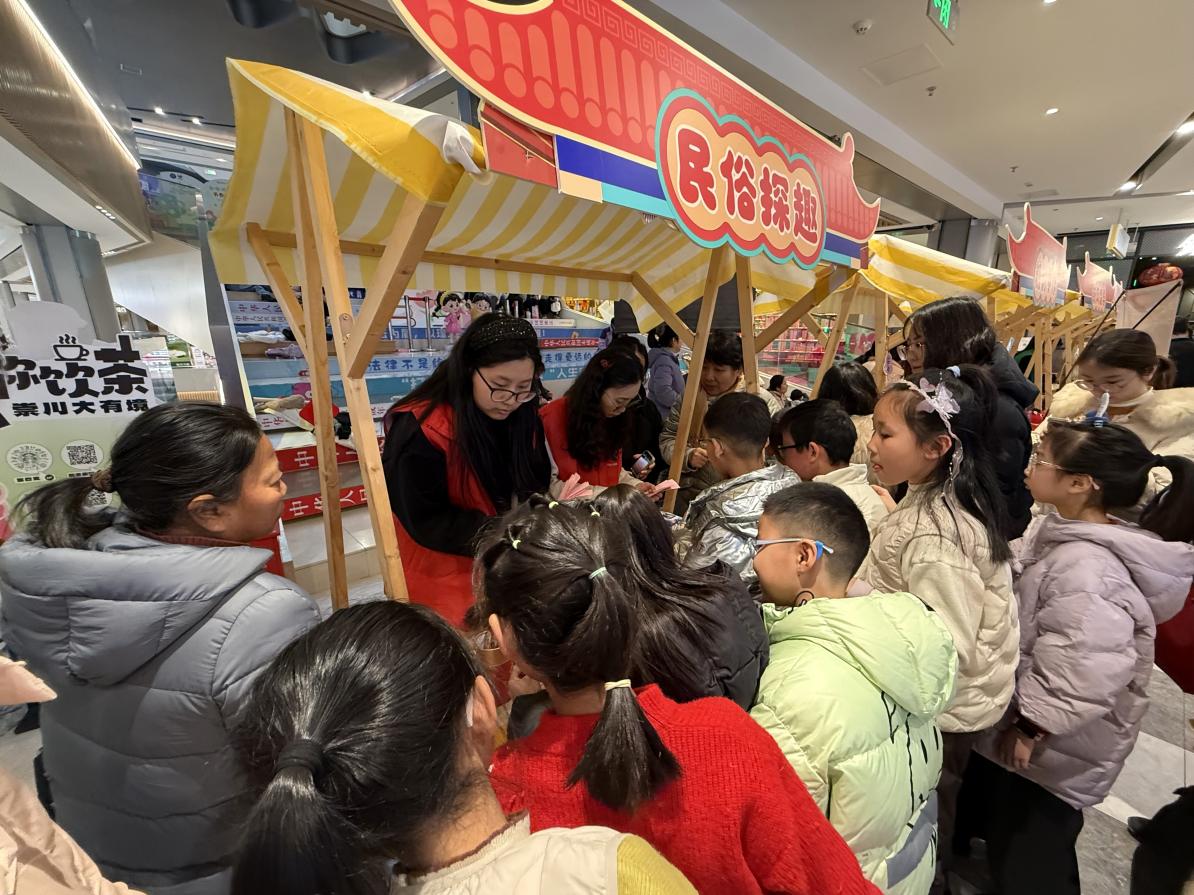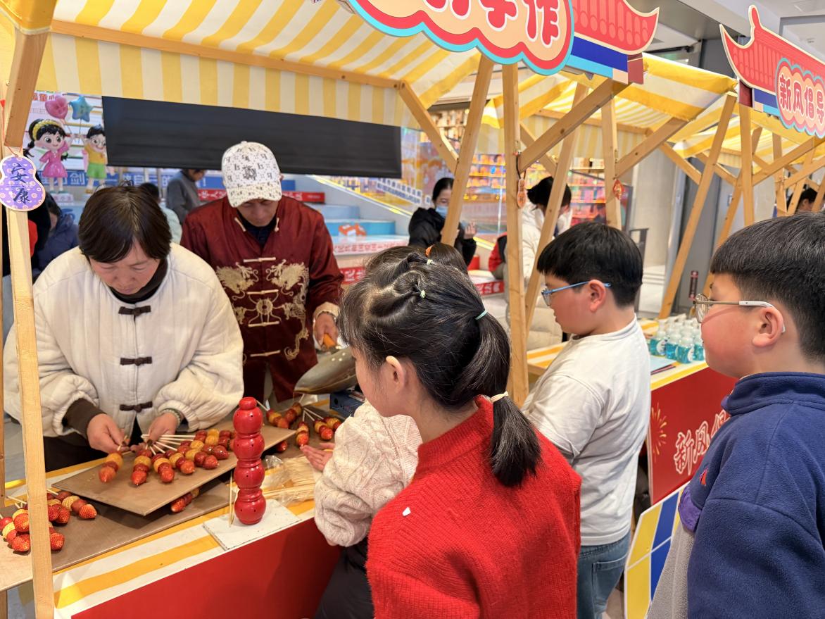 新春氛围渐浓,民俗知识问答区里,“同学们,贴福字倒着贴有什么寓意呀?”社区志愿者刚提出问题,孩子们就争相举手:“寓意福到啦!”从春联讲究到守岁习俗,从年夜饭寓意到舞龙舞狮由来,大家对答如流,欢乐闯关。另一边,非遗糖葫芦手艺人现场教学制作,讲解完糖画与糖葫芦的非遗渊源,便开始展示熬糖、裹串的精湛技艺,孩子们围在一旁惊呼赞叹,“同学们慢点,注意别碰到热糖小心烫哦。”社区志愿者在旁暖心叮嘱道。不一会儿,一串串酸甜的水果糖葫芦新鲜出炉,孩子们捧着糖串喜笑颜开,“闯关学知识,还能吃到甜甜的糖葫芦,这活动太有意思啦!”