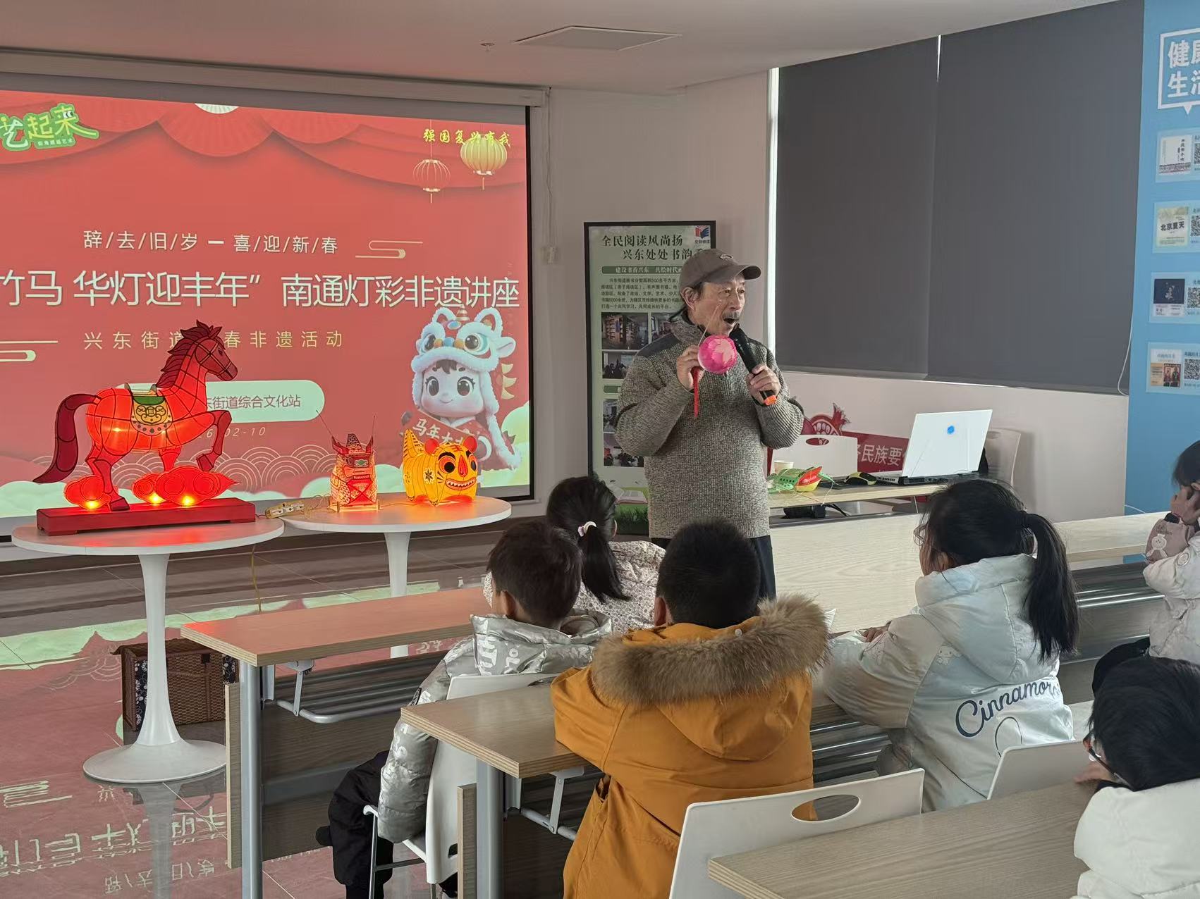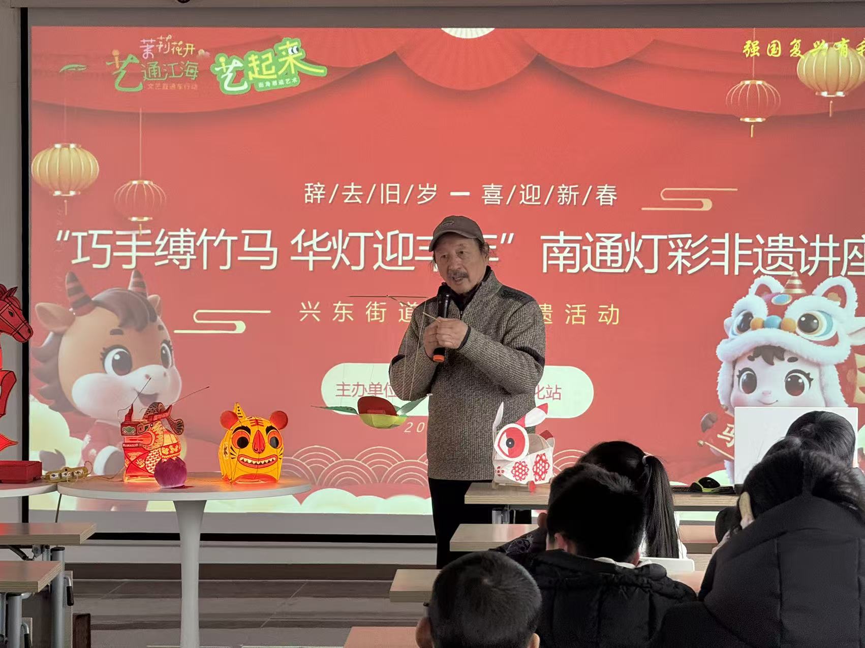 中国江苏网讯 茉莉花香漫街巷,值此岁末年初,“茉莉花开·艺通江海”文艺直通车驶入兴东街道,一场别开生面的“街角艺术邂逅”在此温情上演。南通灯彩省级非遗传承人何麟强老师应邀前来,用一盏盏巧夺天工的花灯,为孩子们打开了通往传统美学的大门,让古老技艺在童心中焕发新的光彩。