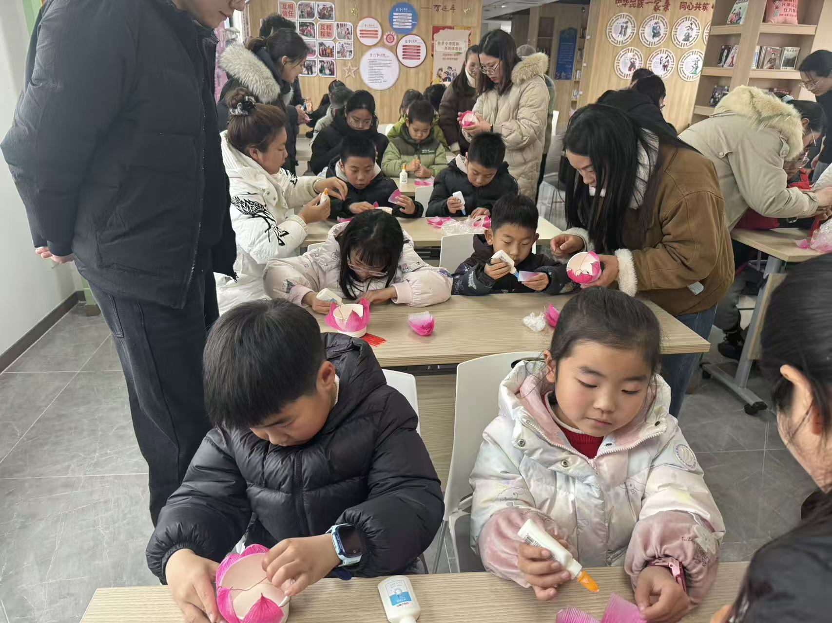 “指尖绽荷韵,灯暖亲子情。”在精彩的讲述与演示后,孩子们早已跃跃欲试。随着纸杯、花瓣形彩纸、小灯等材料分发到手,现场立刻进入了热火朝天的创作环节。孩子们与家长紧密合作,细心粘贴花瓣,巧思设计纹样。大手握小手,一起涂抹、按压、装饰;亲子间低声商量,默契配合。不一会儿,一盏盏独具童趣的荷花灯便初具雏形。当LED小灯在杯底点亮,温暖的光芒瞬间映亮了孩子们充满成就感的笑脸。