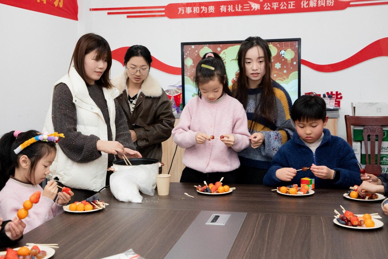 在村工作人员的专业示范后,孩子们在家长的陪伴协助下,兴致勃勃地串水果、蘸糖稀,小手忙得不亦乐乎,现场欢声笑语不断。看着亲手串制的鲜果,裹上晶莹金黄的糖衣,酸甜果香混着焦糖甜香扑面而来,孩子们眼里满是欢喜与期待。这一口香甜的传统年味,唤起了大人们记忆深处的新春温情,更让新业态家庭在携手协作中拉近彼此距离,串起对新年的甜蜜期许。一位新业态家长感慨道:“平时工作忙,能陪孩子的时间太少了,这次活动不仅让孩子体验到了传统美食的制作乐趣,更让我们感受到了村里的温暖与关怀,特别有意义!”