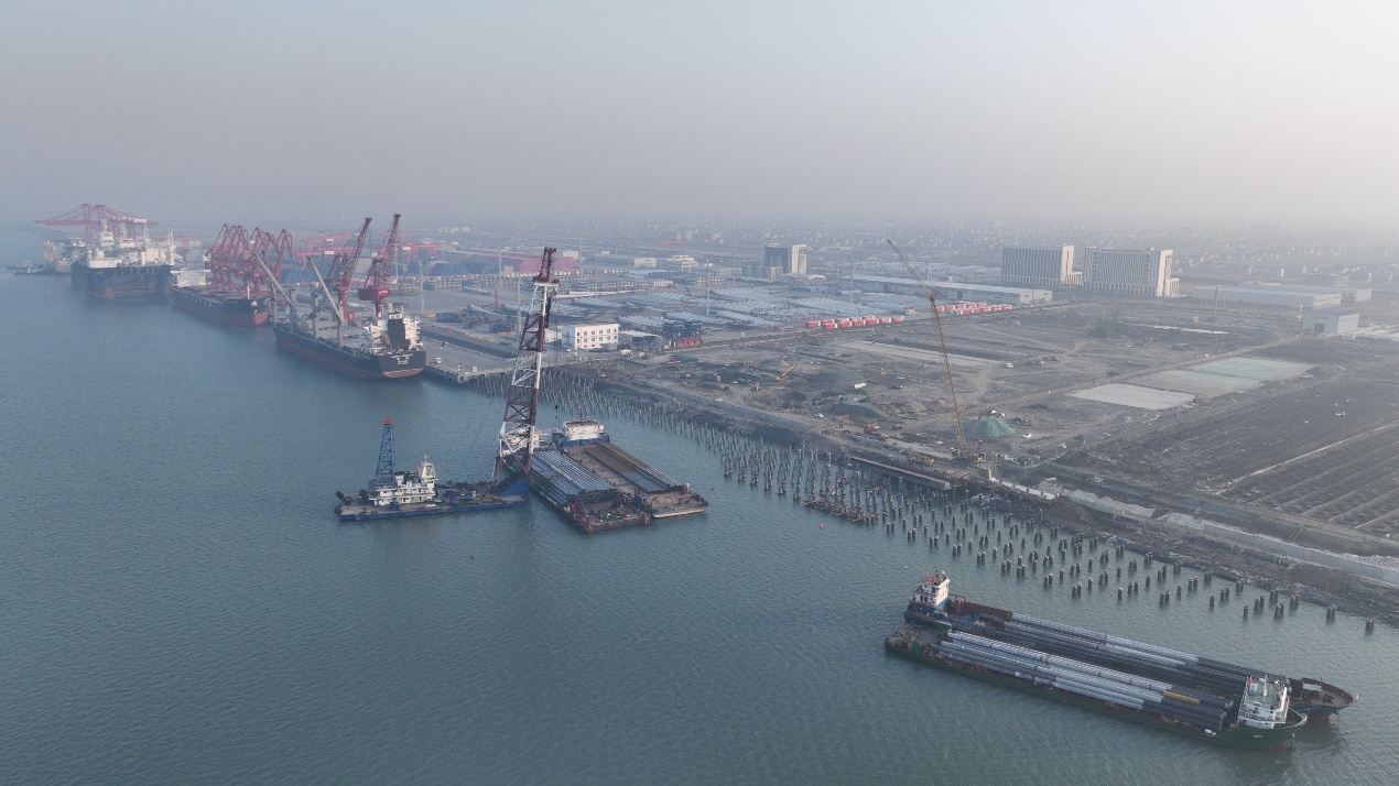 中国江苏网讯 2月13日,农历腊月二十六,年味渐浓。通州湾新出海口吕四起步港区12号、13号泊位施工现场机械轰鸣,随着打桩船将12号泊位最后一根钢管桩精准打入水下,该泊位576根桩基全部沉桩完成。至此,两座新建泊位合计1054根钢管桩全部顺利沉桩完毕,海上打桩工程全面收官,吕四起步港区新“出口”如期实现关键节点突破,以实干实绩迎接新春佳节。