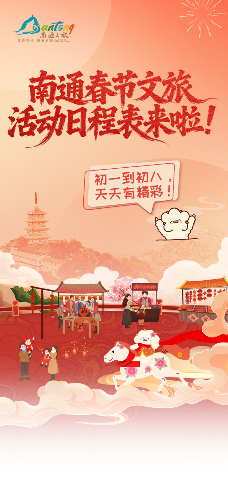 新华报业·中国江苏网讯 这个春节到南通,每天都有文旅大餐!从正月初一到初八,多项文旅活动轮番登场:灯会巡游、非遗展览、戏曲杂技、古镇市集、亲子互动……每天不重样,每天都精彩!收好这份每日打卡攻略,带上家人朋友,来南通过个热热闹闹的马年春节!