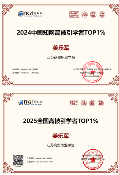 中国江苏网讯 近日,中国知网中国科学文献计量评价研究中心发布“全国高校高被引学者”榜单,江苏商贸职业学院马克思主义学院姜乐军研究员连续两届入选“全国高校高被引学者TOP1%”,同时入选“全国高校历史学高被引学者TOP1%”,为本次评选中历史学领域唯一上榜的高职院校学者。