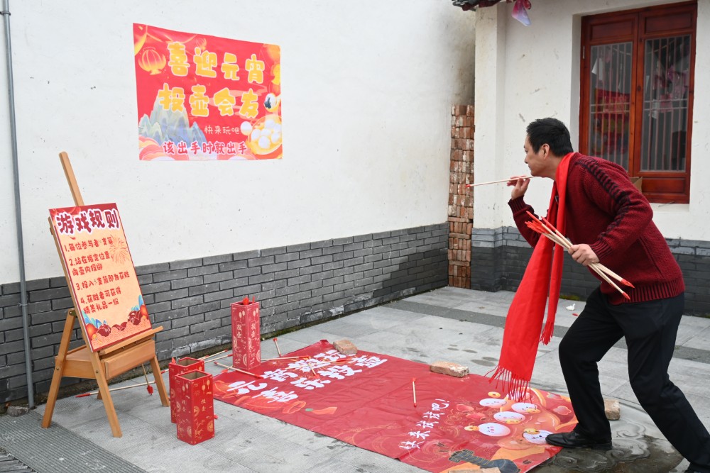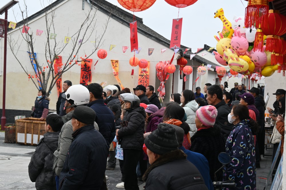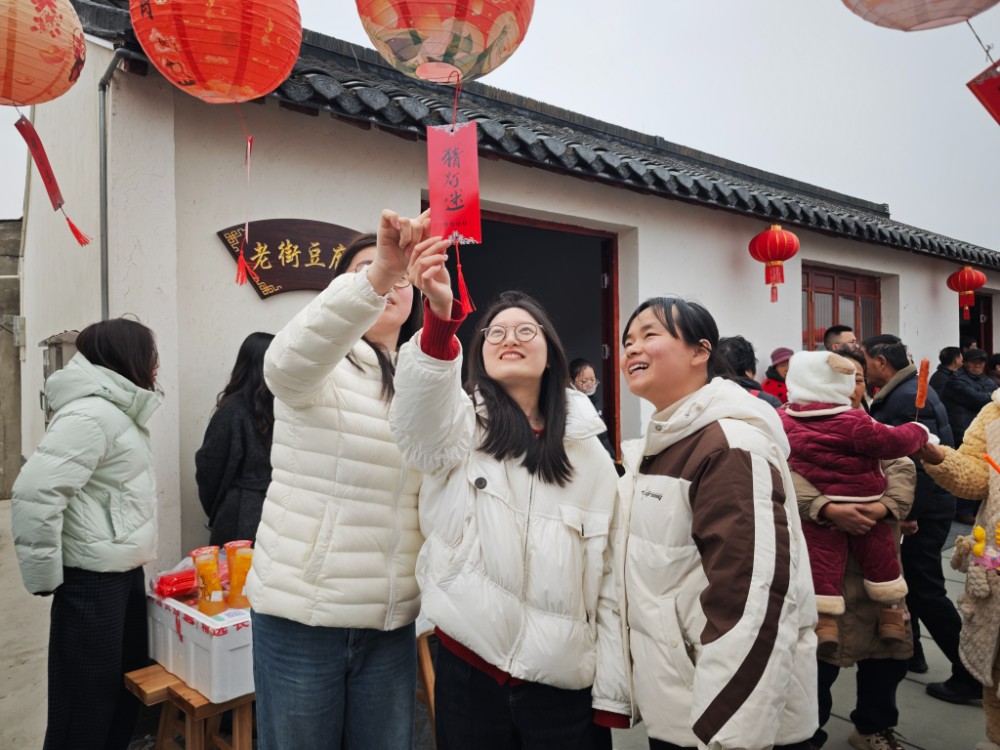 不远处传来阵阵喝彩声,投壶游戏区正热火朝天。群众排起队一显身手,投中者喜提小礼品,现场欢声不断。猜灯谜区挂满五彩谜条,大家或凝神思考,或互相讨论,在趣味中感受传统文化魅力。古街之上,锣鼓声、欢笑声、叫好声此起彼伏,交织成热闹祥和的节日图景。