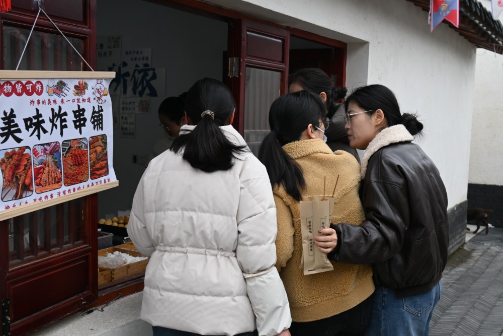 感受完指尖非遗,阵阵香味将人们引向烟火食集。王灶河包子摊位前,传统老酵包子皮薄馅足,鲜香四溢;汤圆摊位,志愿者现场包制黑芝麻、花生汤圆,软糯香甜中品出团圆滋味。本地农产品展销区,盛和斋手工酱瓜等特色产品备受青睐,不少人边逛边尝,惬意十足。此外,奶茶、炸串、关东煮、炸鸡排等便民小吃也备受青睐,满足群众的即时饮食需求,为古街增添了热闹的市集烟火气。