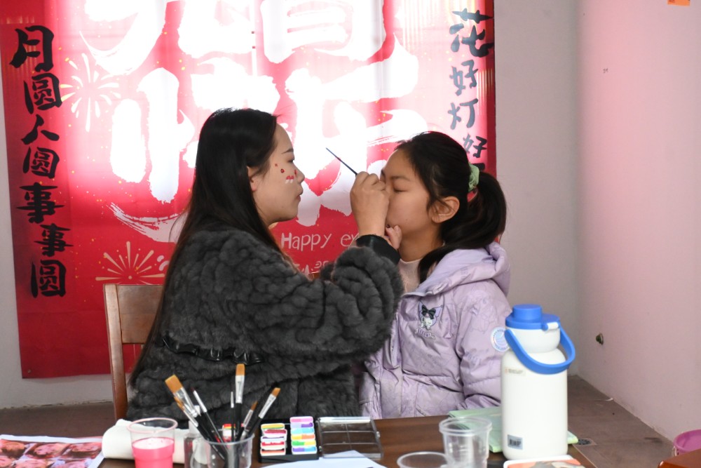 循着歌声往里走,最热闹的是孩子们扎堆的非遗体验区。拓印台前,孩子们在志愿者指导下用红宣纸拓印“福”字,墨香间感受传统技艺;灯笼制作区,小朋友们专注拼装、贴福纹、装灯串,一盏盏童趣灯笼映衬着灿烂笑脸。漆扇制作区人气高涨,群众在素扇上描金点彩,体验手工艺雅致;脸部彩绘区前排起长队,志愿者为孩子们绘制兔子、汤圆等纹样,稚嫩脸庞被装点得俏皮可爱,沉浸式感受节日乐趣。