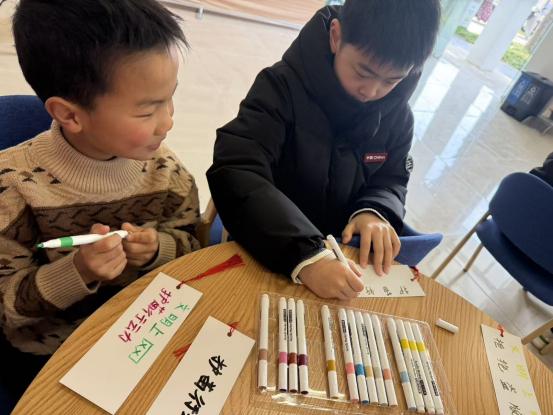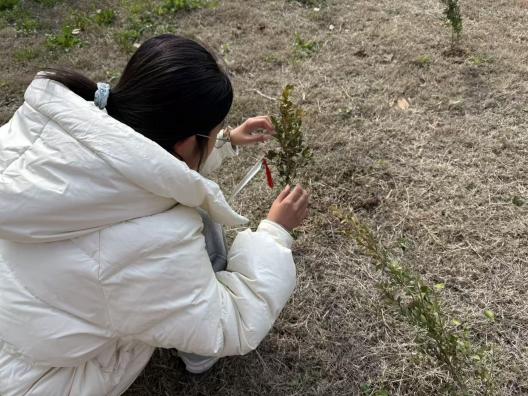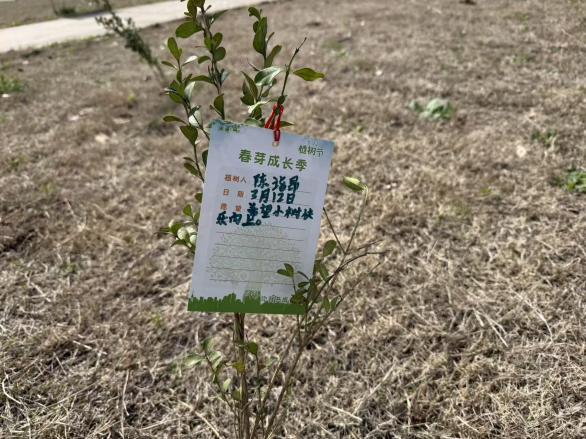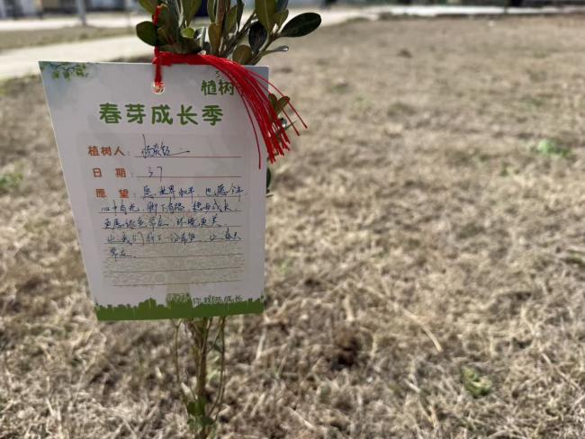纸上得来终觉浅,躬行实践悟初心。活动最后,大家移步植树区,开启“栽种希望树苗”环节。在志愿者的指导下,孩子们两两结伴,挥锹铲土、扶苗填坑、提水浇灌,每一个步骤都做得一丝不苟。孩子们将写有美好期许的卡片系在树苗上,许下“与小树共成长”的约定:“愿小树长成参天大树,愿自己在‘护苗’行动的守护下,向阳而生、茁壮成长。”