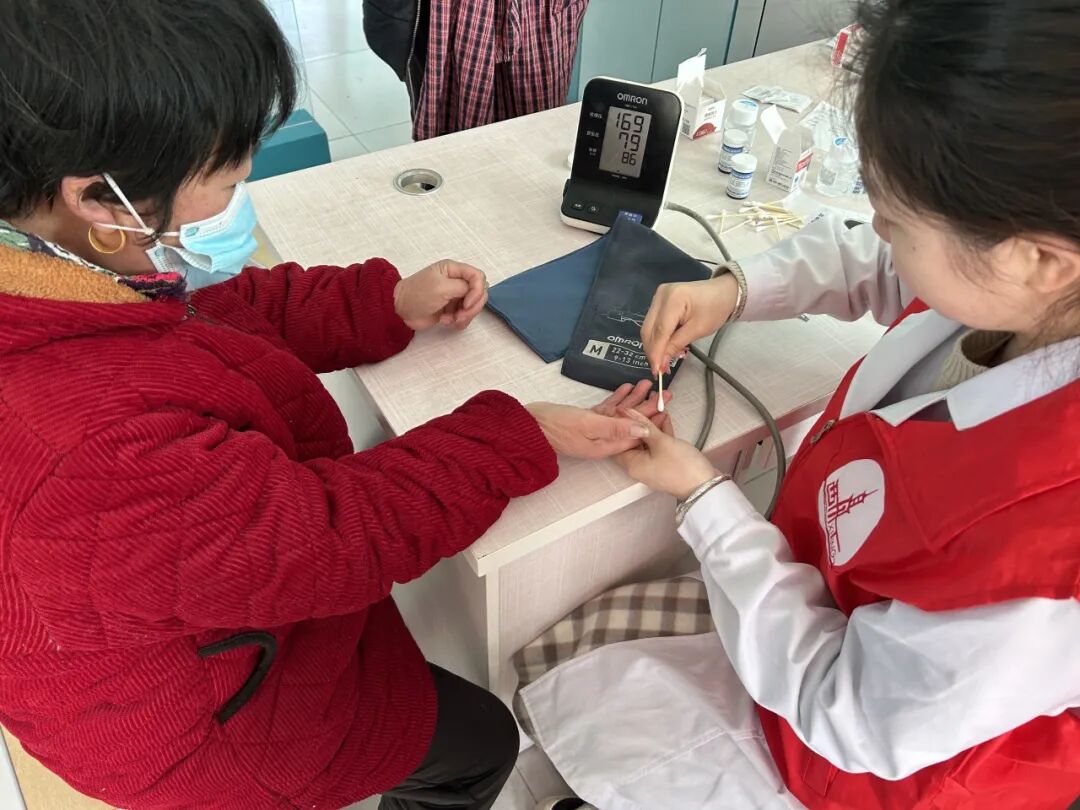 村卫生室为60岁以上老人开展免费体检,医护人员细致测量血压、分析指标,针对慢性病给予个性化指导,并更新健康档案,让老年人就近享受暖心服务。