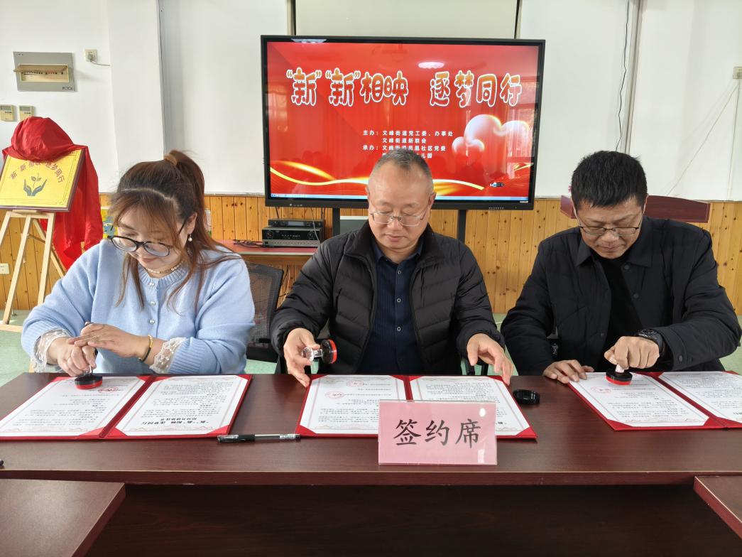 随后,新联会会长及幼儿园园长共同为“‘新’‘新’相映 逐梦同行”结对共建基地揭牌,为后续常态化开展共建活动筑牢了坚实基础。新联会、社区党委、新区幼儿园三方签订共建协议,明确“聚力共建、资源共融、活动共办、发展共促”合作机制。这份协议既是三方携手同行的庄严承诺,更是凝聚合力、共育未来的责任状,为共建活动的有序推进提供了坚实保障。