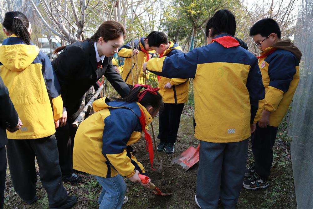 “祝愿小树快快长大!”“向下扎根,向上生长!”同学们将手写的心愿卡系上枝丫。新翻的泥土气息与清脆的笑声在春风中荡漾,一片盎然春色里,法治与希望的种子一同扎根心田。
