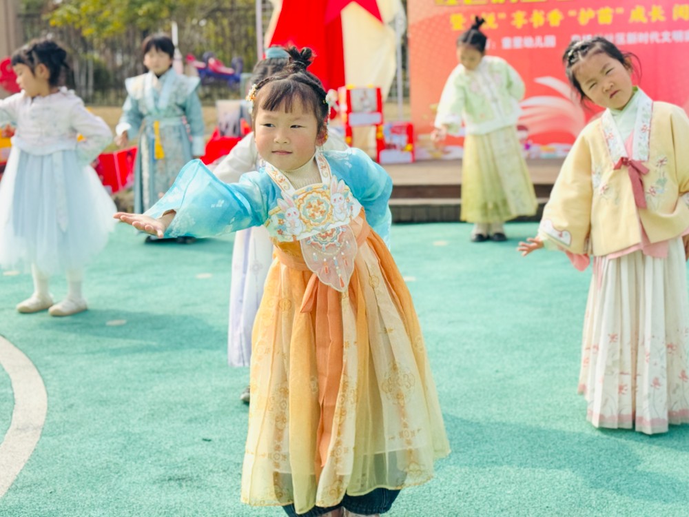 随后的幼儿表演环节精彩纷呈,成为孩子们展示阅读收获的欢乐舞台。古诗串烧以稚嫩童声演绎四季之美,从夏日蜻蜓到窗前月光,让现场感受到阅读始于诗的纯粹快乐;《沁园春·雪》的齐声朗诵铿锵有力,尽显“千里冰封,万里雪飘”的壮阔意境,彰显阅读带来的视野开阔;《观沧海》让孩子们在文字中遇见大海辽阔,体会“小小童心装下大大世界”的奇妙;手势舞《长歌行》以灵动舞姿诠释“少壮不努力,老大徒伤悲”的深意,传递珍惜时光、勤读好书的理念;师生共唱《水调歌头》让千年月光与今日童心相遇,诉说阅读跨越时空的魅力。最后,全体师生齐诵《春晓》,清脆童声与春日美景相映成趣,将活动氛围推向高潮。