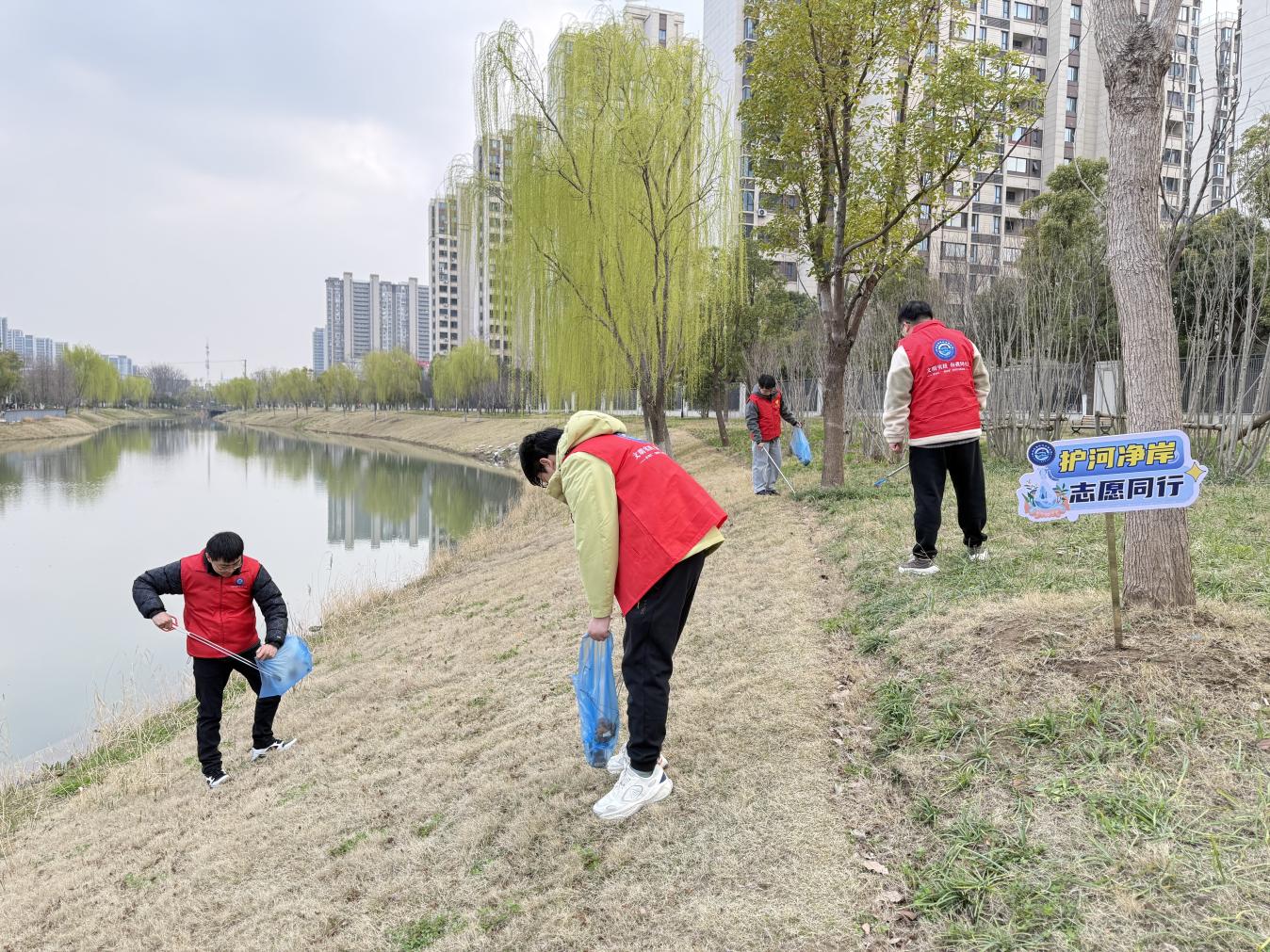 志愿巡河净岸畔,初心护航守碧波。水厂参观圆满结束后,志愿队伍来到夏家桥河河畔,大家迅速化身守护河道生态的“护河使者”,两两结对、分工协作,有条不紊地开展巡河净岸志愿服务行动。志愿者们手持火钳、垃圾袋等工具,沿着河岸步道与坡岸细细检查,逐段细致清理岸边散落的塑料袋、饮料瓶、枯枝落叶、纸屑杂物等垃圾,弯腰俯身不放过草丛缝隙、河堤拐角等卫生死角,彻底清除河岸积存的零散废弃物,全力还原水岸洁净原貌。与此同时,大家还重点巡查河道周边是否存在污水违规排放、建筑垃圾乱堆、河岸破损等隐患问题,逐一做好简单记录,并向过往散步的居民倡导爱护河道环境、杜绝垃圾入河,呼吁居民共同守护家门口的清水绿岸。阳光下,一抹抹鲜亮的志愿红穿梭在绿意盎然的河畔,用实实在在的行动守护河道生态,用点滴坚守筑牢水环境防线,成为春日里一道温暖且充满力量的文明风景线。
