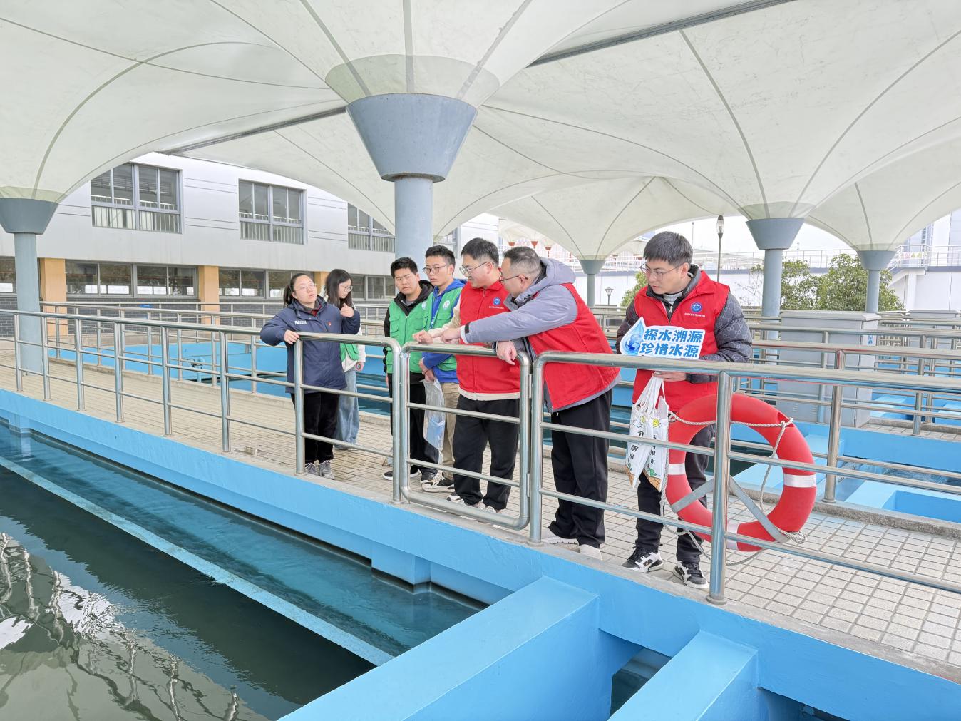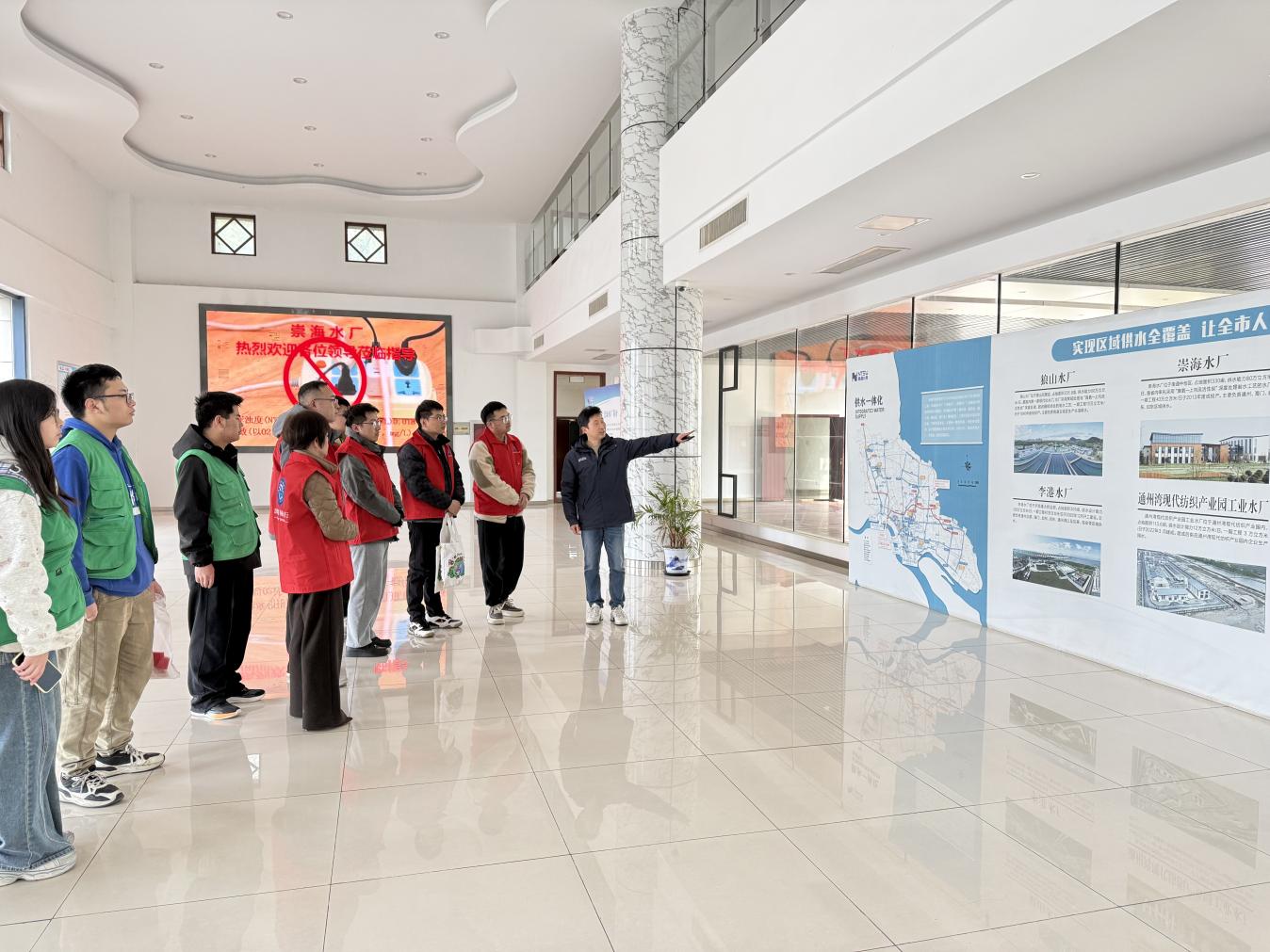 探源启智传心得,净水匠心护水安。“崇海水厂占地面积约330亩,总设计水量为80万m³/日,我们在省内率先使用了当今世界公认的主流技术——‘臭氧一上向流活性炭’深度处理工艺,出水水质远高于国家饮用水标准。”活动伊始,一场干货满满、生动专业的净水知识微课堂,在南通水务集团崇海水厂开讲。水厂工作人员立足一线净水工作,结合城市水源保护、供水保障实际,用通俗易懂的话语、直观清晰的流程讲解自来水从原水采集到入户输送的全流程工艺,每一道环节的操作标准与水质把控都要求细致入微。南通大学绿色方舟环保社团的同学们结合专业所学知识积极提问,围绕水源地生态保护、净水工艺技术、水质安全监测等内容深入探讨,工作人员结合实操经验逐一细致答疑,现场交流不断、气氛热烈。大家全面了解水厂净水工作的严谨与不易,明晰从水源到龙头的层层守护,真切感知城市供水安全的背后保障。