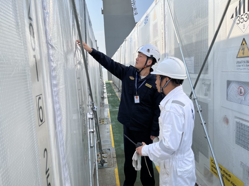 据介绍,该批储能柜为UN3536类9类危险货物,仅允许舱面积载,且对热源和生活居住处所距离均有严格要求,运输安全管控标准较高。为确保这批“新三样”货物安全高效出运,南通海事局提前对接代理与码头,安排远程培训和指导,开通绿色政务服务通道,优化审批流程。装货期间,执法人员现场核查船舶绑扎、系固情况,并开展商渔船安全碰撞宣贯;靠离泊时,综合运用CCTV、智慧海事等系统进行精准调度与维护,保障船舶进出港安全顺畅。