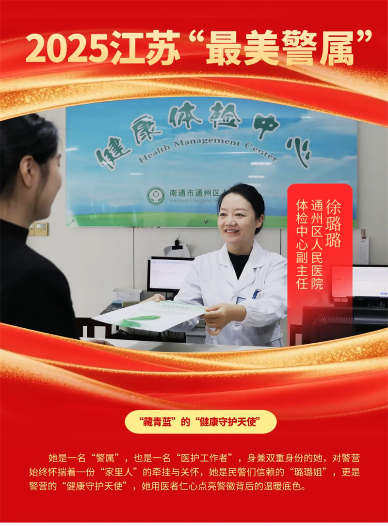 中国江苏网讯 近日,在2025年江苏省“最美警属”评选中,南通市通州区人民医院体检中心副主任徐璐璐脱颖而出,成为通州区唯一获此殊荣的警属。这位集警属与医务工作者双重身份于一身的女性,用十余年如一日的坚守与付出,书写着不平凡的健康守护篇章。