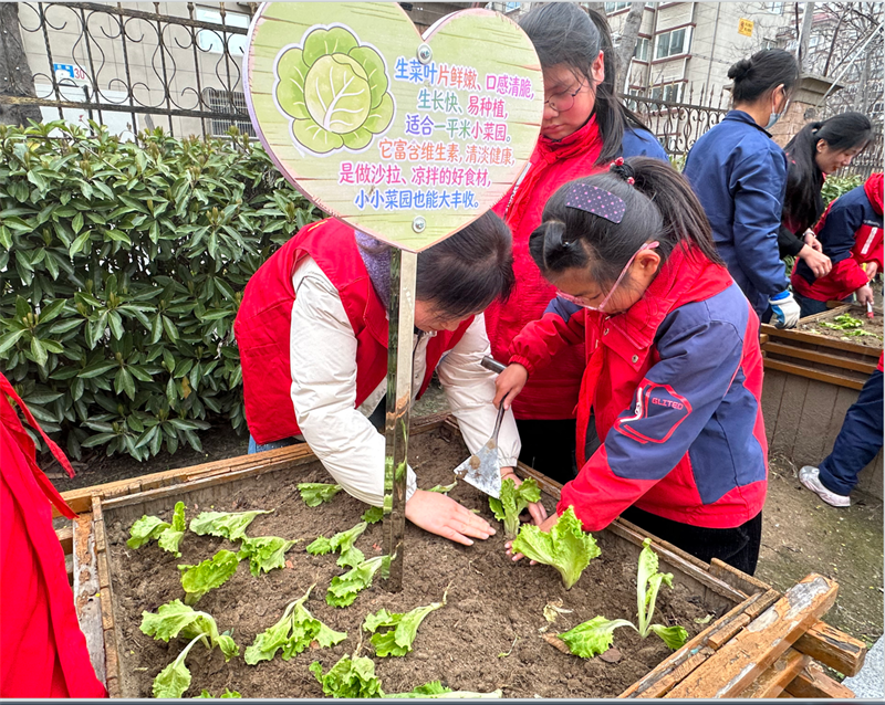 在“大拇指耕读园”,玉米、四季豆、黄瓜的种子被播下,大家期待着丰收时刻;“一平米小菜园”里,生菜和油麦菜苗扎根生长,为校园增添了清新绿意;“一捧药香田”中,芍药、艾草、薄荷等药用植物整齐排列,让同学们感受到中医药文化的魅力。