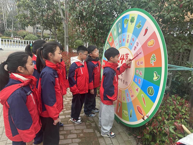 种植活动结束后,孩子们围聚在二十四节气转盘展板前,立春、雨水等节气旁的农作物图案吸引着他们驻足观察、探索发现,开启了一场充满乐趣的自然与文化学习之旅。