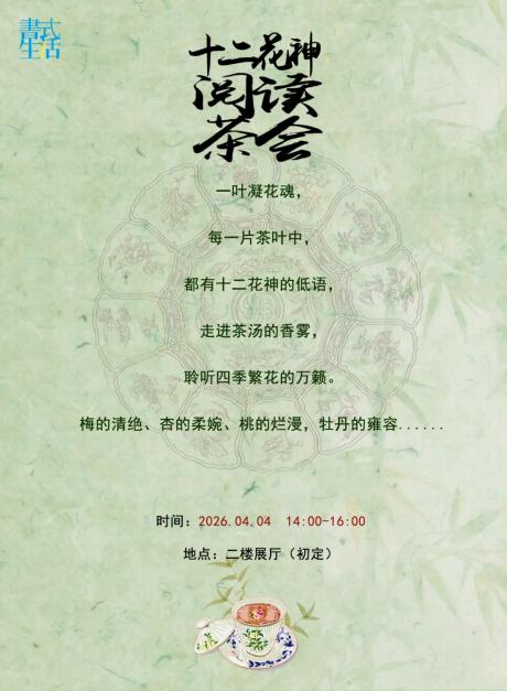 读者入场签到,抽取“花神签”,确定本次属于自己的代表花神。签到同时,领取一张特制的“花神书缘卡”和一枚空白书签。现场设立“花神主题图书⻆”,陈列与十二月花神相关的诗词集、植物图鉴、传统文化、古典小说(如《红楼梦》中涉及花神情节的篇章)等书籍,供读者在活动开始前自由翻阅。文化老师系统讲解“十二花神”的来历、典故及文化寓意。茶艺老师同步介绍与各月花神相对应的特色花茶及其养生、文化内涵。读者自由交流品茶感受、对花神文化的理解。