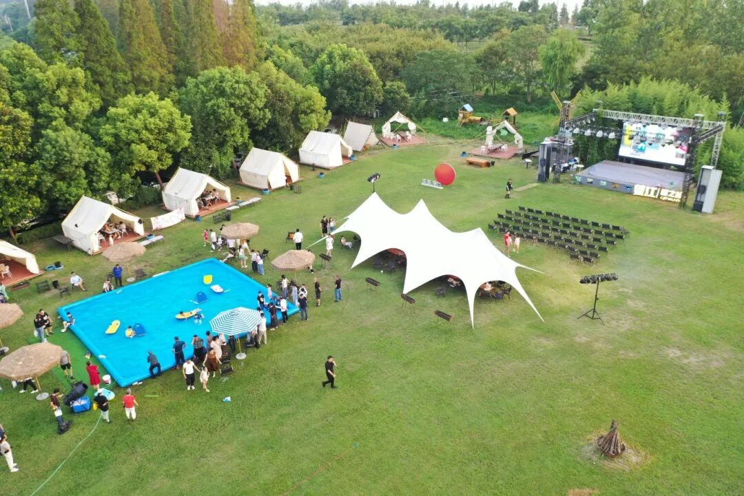 云栖星境项目以草坪、天幕为核心区域,配套打造沙滩营地、亲水溯溪、水上运动项目等,从“草坪+天幕”升级为“城市文化运营引擎”。