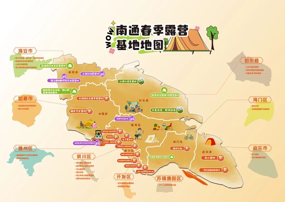 南通世外桃园露营基地位于南通开发区,坐落于长江边,距苏通大桥6公里,距南通市区15公里,交通便捷。世外桃园露营地开发利用长江滩涂,营造返璞归真、风格各异的建筑群体和人与自然和谐生态景观,多层次、多角度地展现绿色田园风光和乡村露营生活环境,为旅客营造自然情趣的乡村露营休闲氛围。桃园露营基地由滨江度假区、水上游乐区、田园牧歌区、悠然垂钓、拓展教育露营区五个园区构成,为游客搭建集旅游观光、农业生产、轻团建式露营、蔬果采摘、生态餐饮、会务度假各类功能于一体的乡村农业旅游项目。