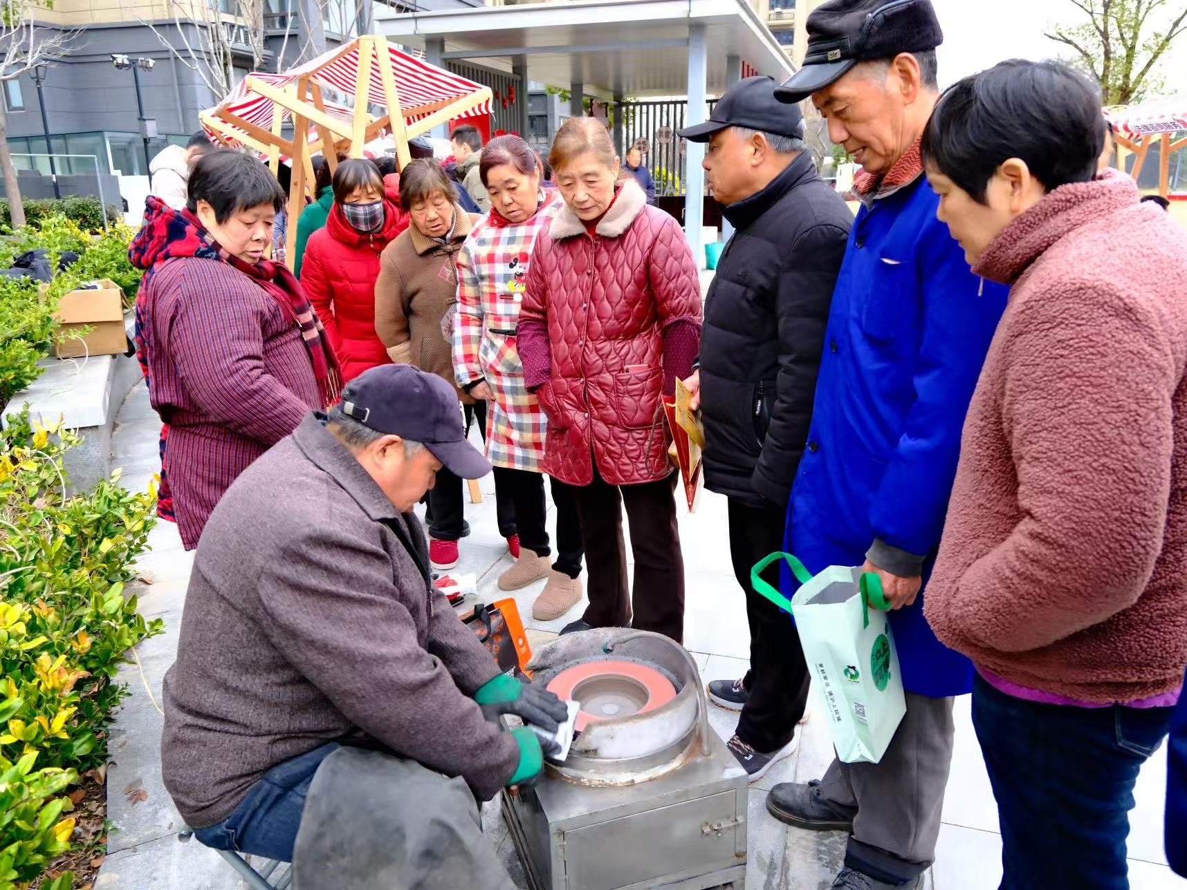 公益课堂结束后,便民服务集市随即开市,集市设置了医疗义诊、法律咨询、免费磨刀与手机贴膜等便民服务区域,让居民在家门口就能享受便捷、专业的暖心便民服务。医疗义诊区人头攒动,工作人员为居民免费测量血压、血糖,耐心解答居民的健康疑问,针对高血压、糖尿病等常见慢性病,给出个性化的诊疗建议和日常养护方法,用专业的医疗服务守护居民身体健康;法律咨询区依旧由专业律师坐镇,聚焦消费维权、邻里纠纷等居民关注的法律问题,一对一进行普法答疑,为居民提供专业的法律援助,让法治服务触手可及;免费磨刀、手机贴膜的便民服务区域更是人气爆棚,志愿者们细心打磨每一把剪刀、菜刀,精心为居民的手机贴好膜,用细致的服务解决居民生活中的实际小难题。各服务区域秩序井然,居民按需参与,现场处处洋溢着温馨和谐的氛围。