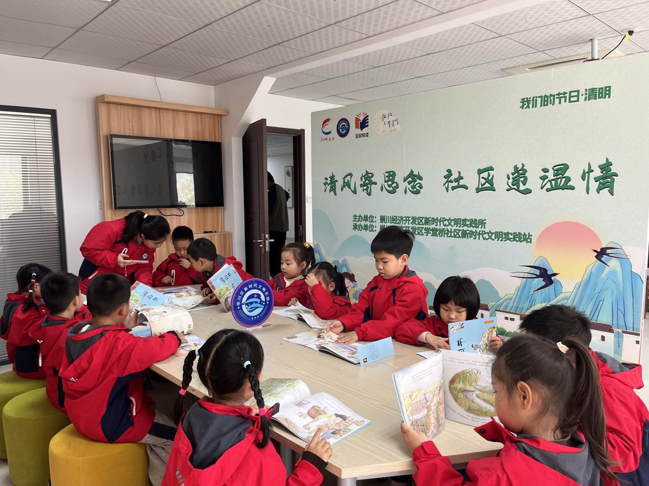在志愿者的陪伴下,孩子们围坐在一起,认真阅读清明主题绘本。当读到“借问酒家何处有,牧童遥指杏花村”时,志愿者们放慢语速、耐心讲解,用生动形象的语言帮助孩子们理解诗句意境,感受清明时节的民俗风情与传统文化底蕴。孩子们一边翻看色彩斑斓的绘本,一边轻声跟读,在诗句中感受清明的诗意与温情。绘本阅读为载体,传统文化润童心,不仅加深了幼儿对清明习俗的认知,更在潜移默化中培养了孩子们感恩追思、尊重传统的美好情感,让中华优秀传统文化在幼小的心灵中生根发芽。