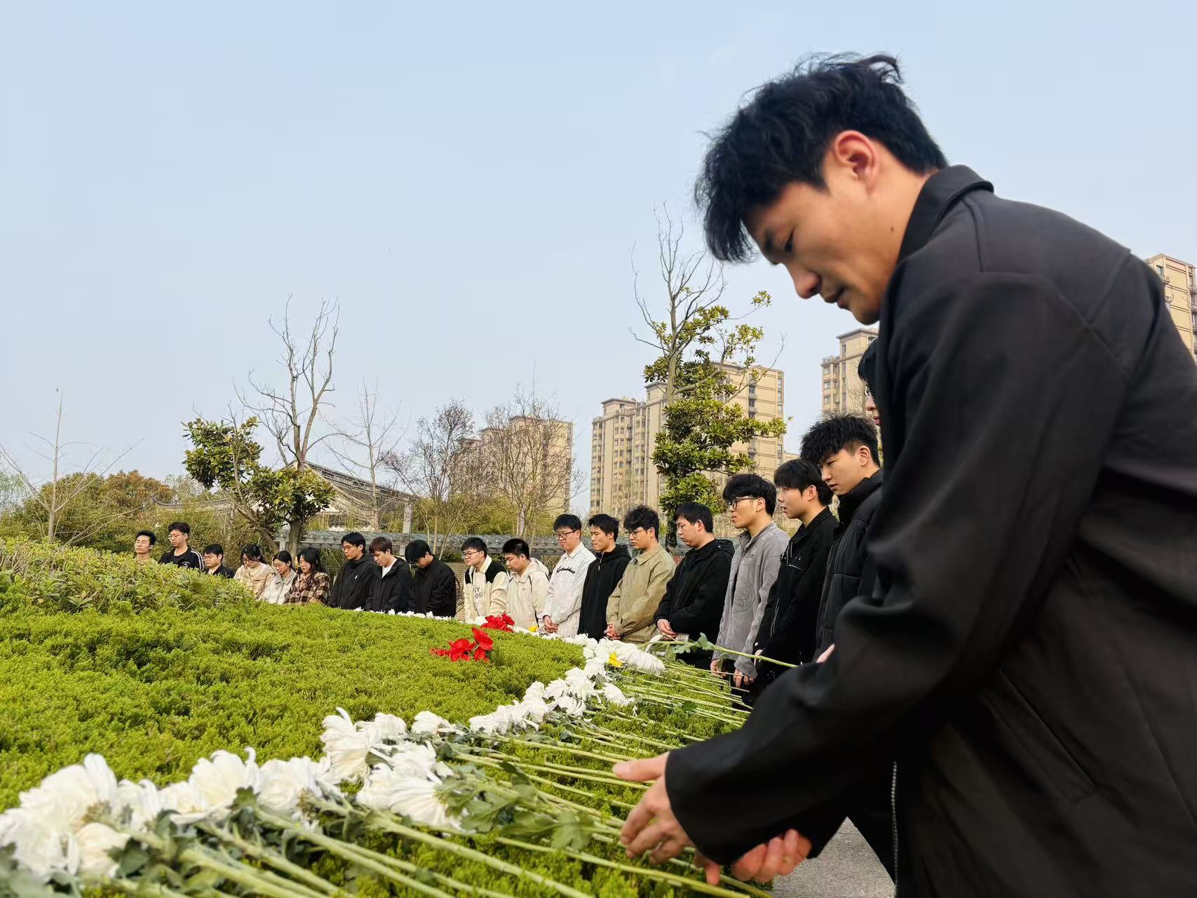 白云含悲,杨柳寄思。默哀结束后,全体人员缓步绕行纪念碑,依次向革命先烈敬献洁白的菊花,每一朵菊花都凝聚着对先烈的敬仰和缅怀。