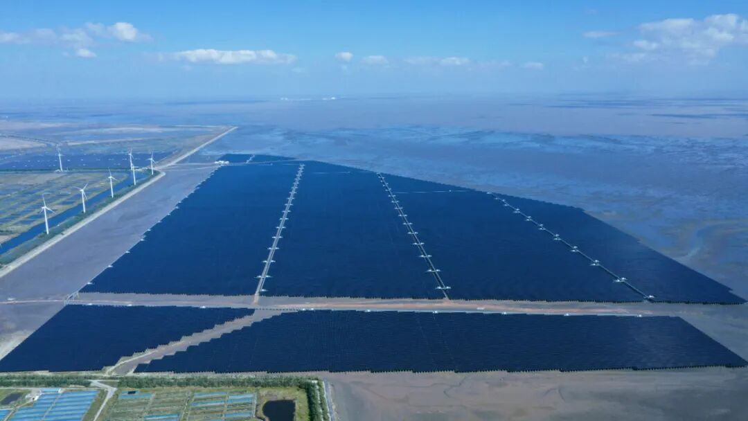 如东的潮间带,每天两次涨潮退潮,让这片土地一半是海、一半是滩。如今,4300亩的光伏板整齐排列在滩涂上,在阳光下泛着蓝黑色的光。而远处,巨大的风机迎风转动,与光伏板遥相呼应。这“一上一下、一高一低”的布局,正是如东对同一片海域的“精耕细作”。