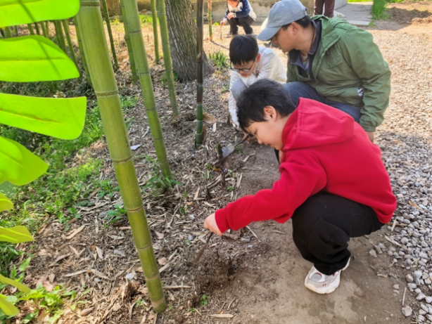 “春雷一响,春笋破土。”当竹林里的第一缕阳光穿过叶隙,孩子们已经挎着小竹篮,跟着老师钻进了翠绿的竹海。志愿者老师蹲在地上,拨开落叶露出笋尖:“看,这尖尖的‘小帽子’下面,藏着一个正在努力生长的小家伙。”孩子们小心翼翼地用小锄头挖开周围的泥土,看着粗壮的笋身渐渐显露,兴奋得眼睛发亮。“春笋一天能长多少厘米?”“竹子属于什么科植物?”一个个问题在林间回荡,老师笑着解答:“竹子扎根地下几年,积蓄力量,一旦破土就会拼命向上,这就是成长的道理。”阳光透过竹叶洒在孩子们沾着泥土的脸上,他们捧着亲手挖出的春笋,仿佛读懂了生命拔节的秘密。