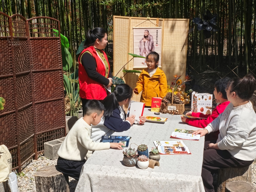 没有课桌,没有黑板,一场“林间书声”阅读会正在进行。志愿者捧着《昆虫记》,坐在草地上念道:“蝉在地下潜伏四年,才换来一个月的歌唱。”“我读过《十万个为什么》,知道蜜蜂怎么跳舞!”一个小女孩迫不及待地分享自己的阅读心得。在这里,书本不再是枯燥的文字,而是连接自然的桥梁。孩子们或独自翻阅绘本,或三五成群讨论书中的动植物,春风拂过书页,也拂过他们求知的心灵。