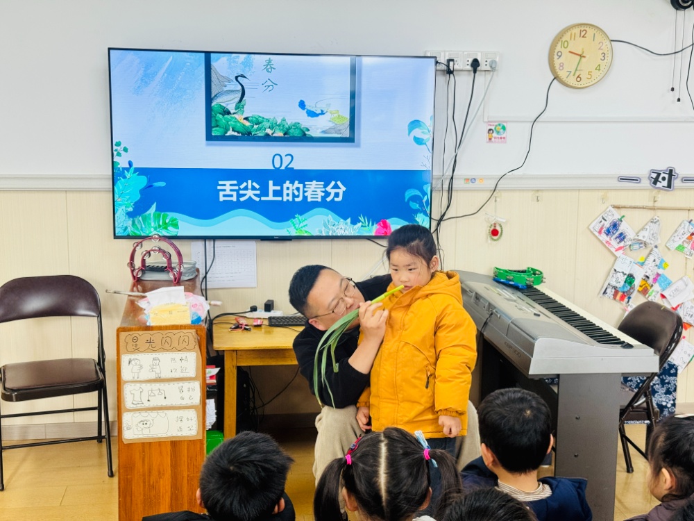 民俗润心,童趣体验传承古韵。在“春分竖蛋”体验区,闸西中心幼儿园的孩子们屏息凝神,尝试将鸡蛋立于桌面,成功者欢呼雀跃,失败者再接再厉,现场笑声与惊叹声此起彼伏。另一侧的“春分识春菜”互动中,志愿者手持荠菜、香椿等时令蔬菜,教孩子们通过观察叶片形态、触摸纹理辨别春菜,并讲述“春分吃春菜”的习俗寓意,让传统饮食文化在互动中生根发芽。