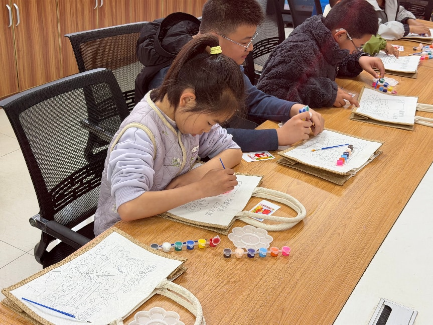 宣讲结束后,社区趁热打铁组织孩子们开展国家安全主题手提包上色趣味绘画活动。孩子们拿起彩笔尽情创作,将国旗、和平鸽、长城、安全盾牌等元素融入画作,用缤纷色彩描绘心中的国家安全图景。在动手创作的欢乐氛围中,让孩子们进一步加深对国家安全的理解,让安全意识在心中生根发芽,实现寓教于乐、以画育心的良好效果。